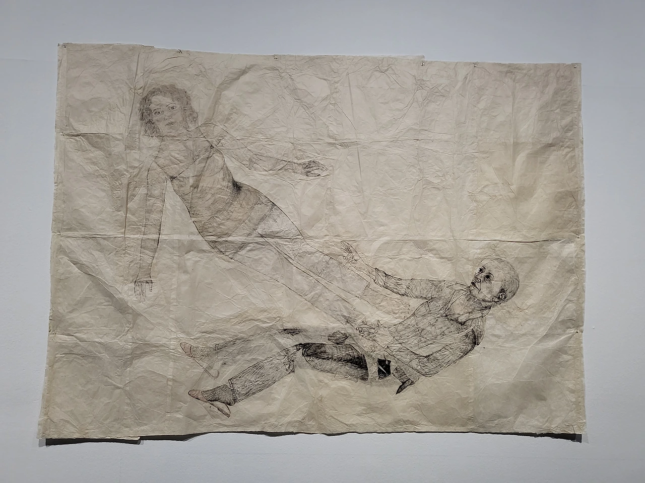 특히 이번 전시의 제목 '자유 낙하'는 그녀의 작품 '자유 낙하'에서 따온 것인데 일반적으로 그림은 절대 접지 않는다. 아주 완벽하게 빳빳한 캔버스 위에 그린 그림이 액자 속에 놓여 있다. 그러나 그녀의 '자유 낙하'그림은 조각조각 여러 겹으로 접은 것을 가끔 펴 본다고 한다. 아마도 그녀 자신의 사진으로 작업한 것인데 자화상 아닐까. 높은 곳에서 떨어져서 공중에 떠 있는 듯한 느낌, 어디로든 떠다니며 갈 수 있는 자유로움, 엄마의 뱃속 태아가 양수에 떠 있는 것 같은 안온함을 느끼고 싶을 때 이 그림을 펴 보는 것 아닐까. 그리고 구겨진 종이에 그린 그림들도 색다른느낌을 준다.