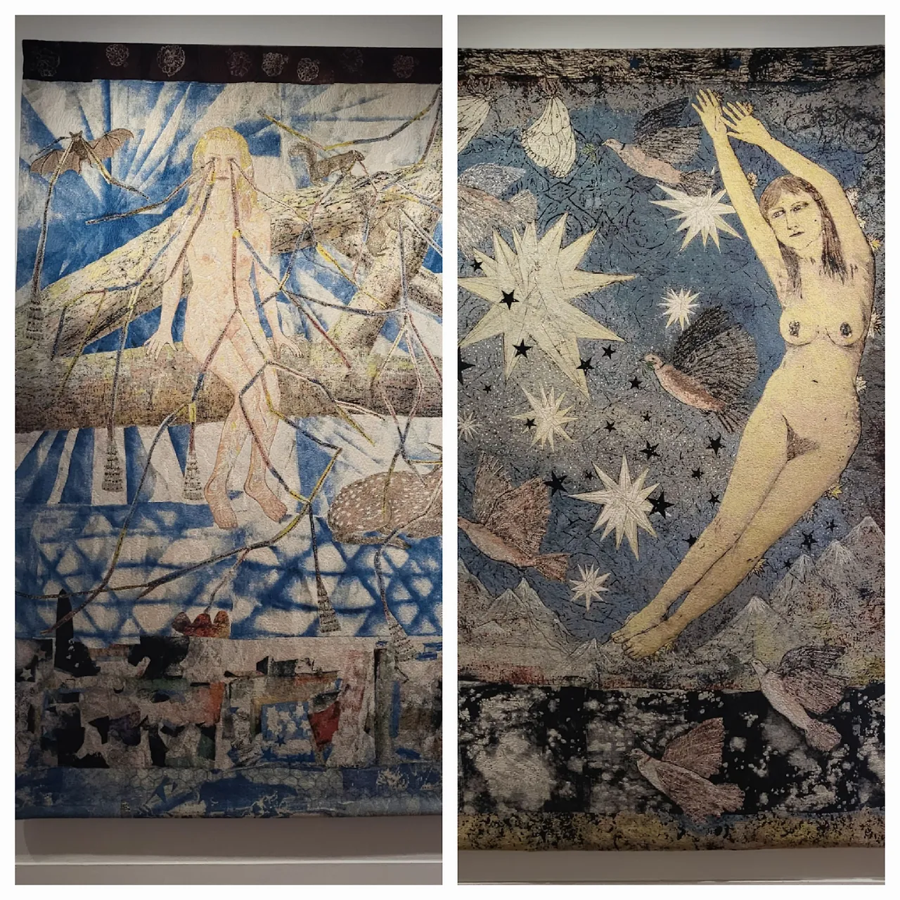 오늘 시립미술관에서 열린 '키키 스미스'의 방대한 작품 활동을 보고 왔다. 그녀는 40년간 미술활동을 했는데 다양한 재료들을 사용하여 표현했다.그 중 태피스트리(다채로운 색실로 무늬를 짜 넣은 직물) 작품도 있다. 직접 직조한 건 아니고 제작을 위한 도안을 만들고 완성된 직물 위에 그림을 그려 넣었다고한다.