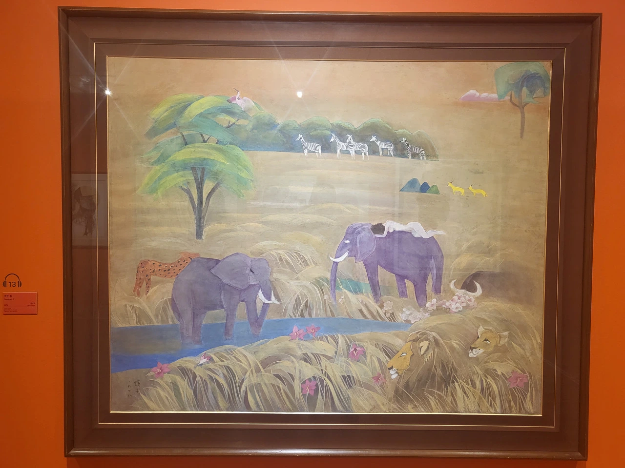 그리고 바로 옆에 천경자 화가의 작품이 있었다. '초원'은 가장 오랜 시간 바라봤다. 선들이 너무 부드럽고 표범 앞에서도 움찔하지 않는 코끼리, 꽃 속에 파묻힌 사자, 코끼리 등을 타고 누운 나부, 아마도 그 나부는 천경자 작가이자 바라보는 관객 그 누구라도 될 것 같다. 나무, 초원의풀들, 코끼리의 귀, 사슴, 얼룩말의 곡선들이 바람과 함께 내 마음을 간지럽혀 주는 것 같았다. 물소, 코끼리, 표범, 사자, 사람, 그 누구도 상대를 헤칠 마음이 없이 한 곳에 있으니 그곳이 천국 아니겠나. 저 멀리 얼룩말과 나무 위에 학, 사슴까지 조화를 이루어 초원은 더없이 평화롭고 자유롭다. 이런 그림은 거실에 두고 날마다 보고 싶은 생각이 든다. 음악을 들으면서 늘어지듯 그림도 똑같다. 공포스런 그림을 보면 마음이 오그라붙고 머리가 쭈뼛 서듯이. 한없이 차분하고 고요함 속에서 무한한 상상을 하고 나만의 여행을 할 수 있는 그림 그리고 음악이 있어서 인간은 그나마 버티는 모양이다.