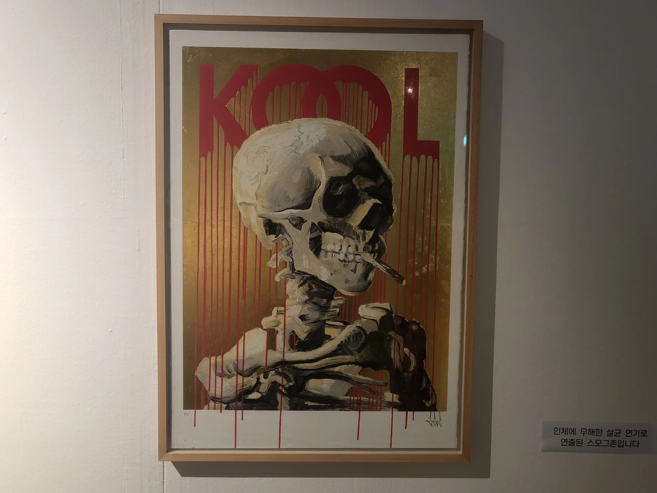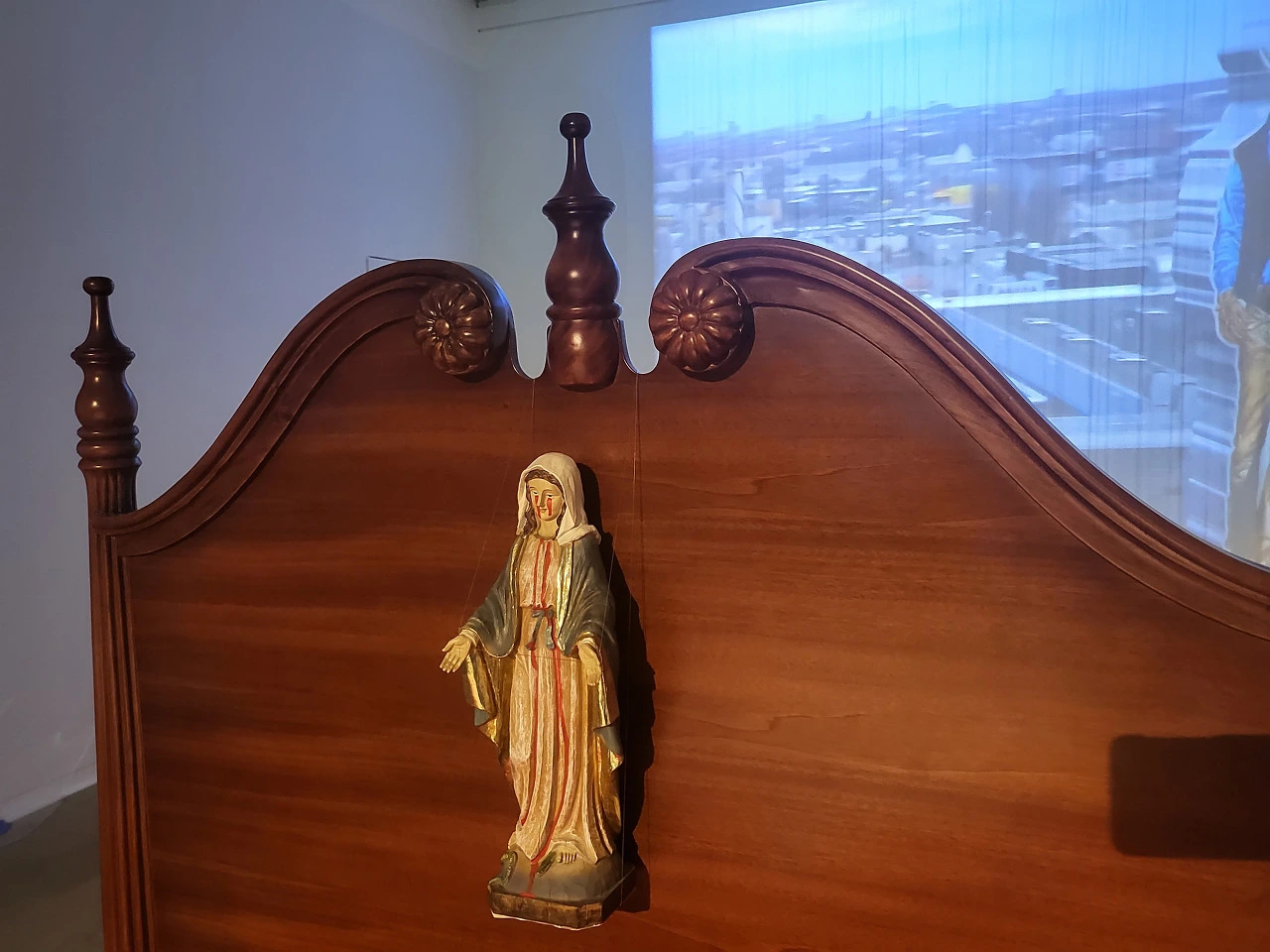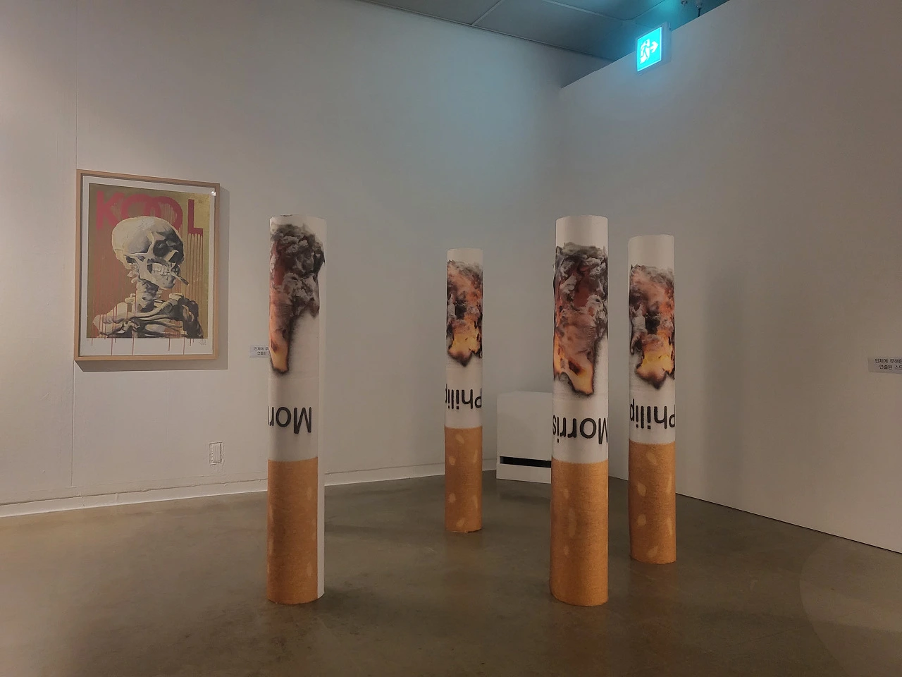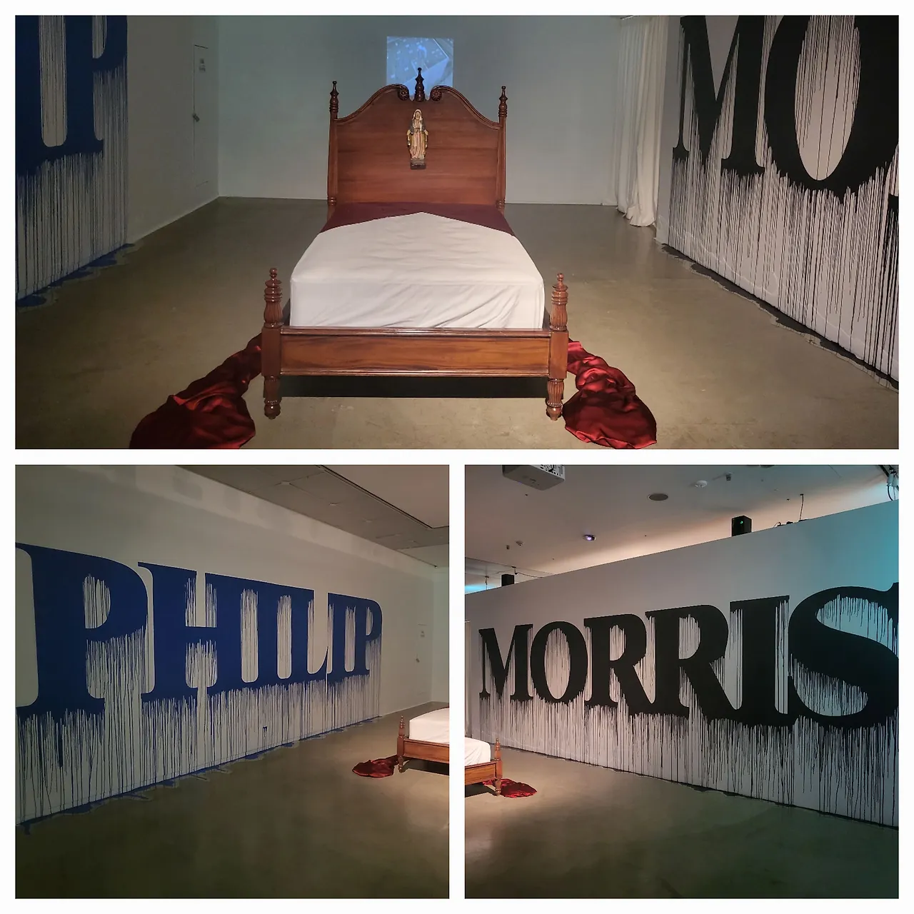 마지막 전시공간에는 침대가 있고 벽에는 필립모리스가 흘러내리고 티브이가 작동되고 있다. 일상적인 우리의 안방 같은데 침대머리에는 마리아가 붉은 눈물을 흘리고 있다. 결국 모든 것은 다 사라질 것이라는 분위기를 주어 공포스럽다. 우리가 매일 안방에서 시간을 소비하고 시간을 흘려보내다가 언젠가는 흔적 없이 사라지게 될 것이라는 걸 암시하는 듯했다. 그러므로 우리의 욕망을 각자 들여다보고 멈추어야 하는 것들이 무엇인가를 생각해보게 한다.