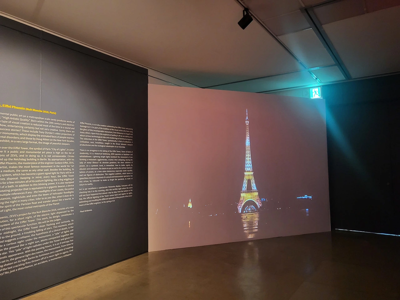 파리 에펠탑 불빛이 반짝이다가 사라지는 걸 보여주는 퍼포먼스를 펼쳤다. 에펠탑을 문명의 상징으로 보고 어느 날 불빛이 사라진 에펠탑에서 작가는 암흑이 된 세계의 종말을 본 것 같다.