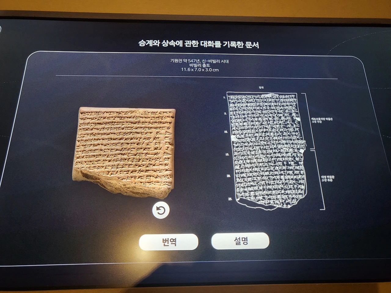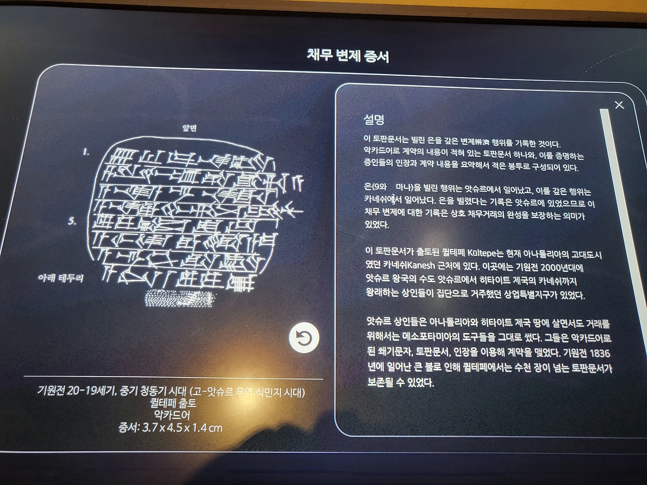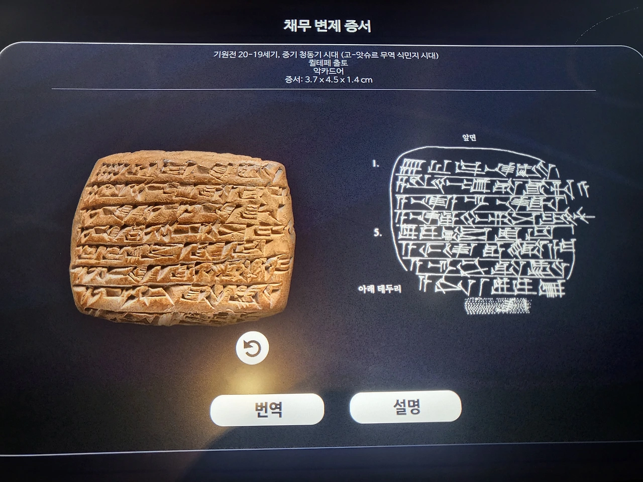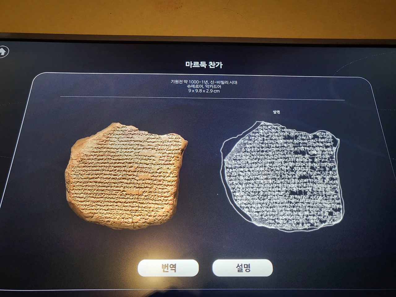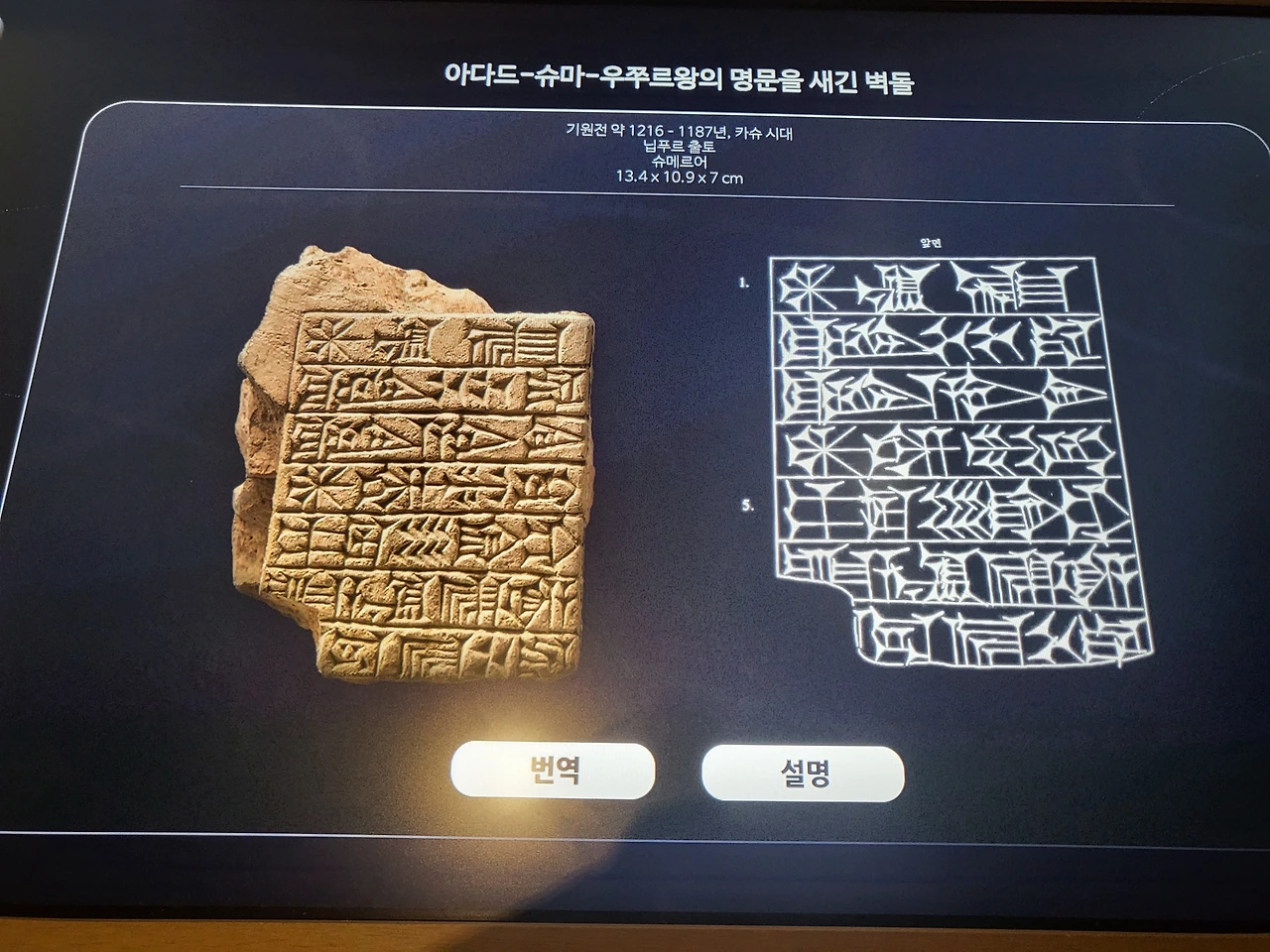 메소포타미아에서 처음에는 그림문자를 쓰다가 쐐기문자를 썼다. 강가의 점토와 갈대를 종이와 펜처럼 사용했다. 갈대를 깎았을 때 생기는 세모난 면으로 쐐기모양을 점토판에 꾹꾹 눌러 적었다. 쐐기모양은 윗부분이 넓고 밑부분이 점차 좁아지는 V자형의 모양이다. 슈메르인들이 사용하려고 만들었으나 악카드인들도 차용하여 썼다고 한다. 수업시간에 쐐기문자에 대해 수없이 가르쳤지만 실물로 보니까 새로웠다. 여러 유물 중에서 제일 재미있었고 오랜 시간 들여다봤다. 마침 학교에서 초, 중등 아이들이 견학을 와서 돌아다니고 있었는데 바람처럼 휙휙 돌아다니느라 자세히 보지는 않는 것 같았다. 나만 보물 보듯이 한참을 바라보고 터치스크린에 가서 글자들을 해석해 놓은 것을 하나하나 봤다. 그리고 미디어로 보여주는 쐐기문자도 흥미로웠다.