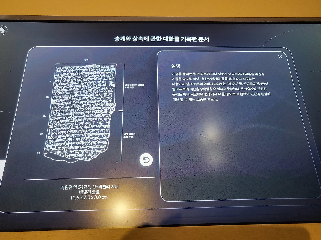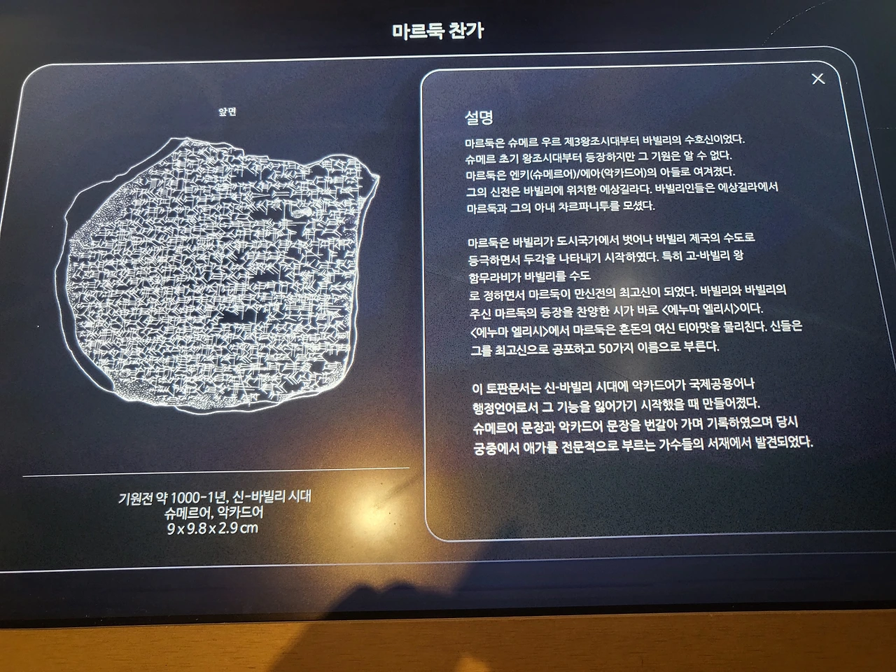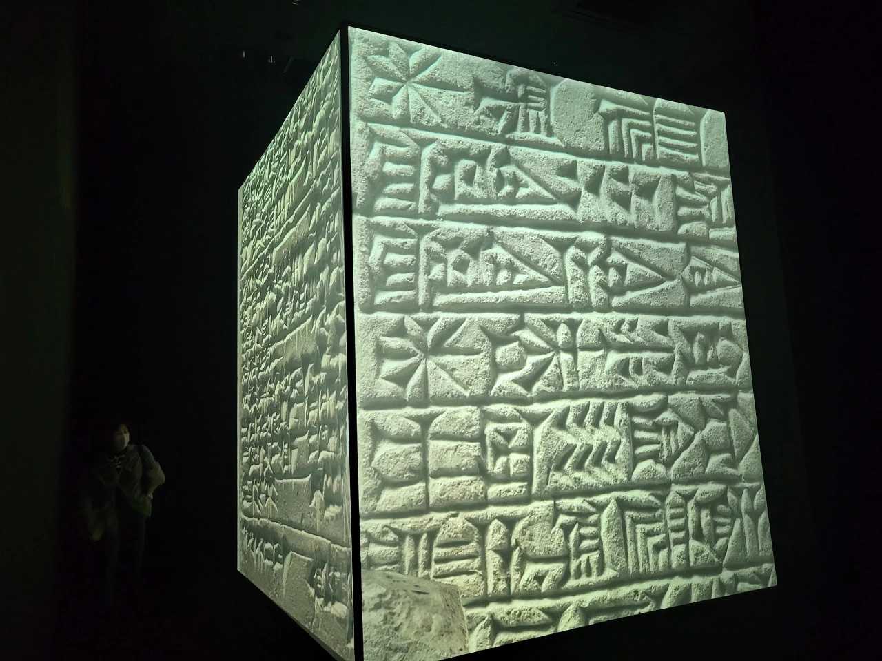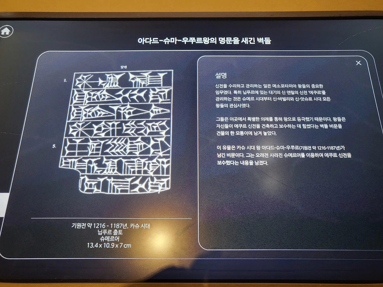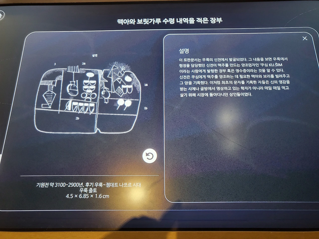 메소포타미아에서 처음에는 그림문자를 쓰다가 쐐기문자를 썼다. 강가의 점토와 갈대를 종이와 펜처럼 사용했다. 갈대를 깎았을 때 생기는 세모난 면으로 쐐기모양을 점토판에 꾹꾹 눌러 적었다. 쐐기모양은 윗부분이 넓고 밑부분이 점차 좁아지는 V자형의 모양이다. 슈메르인들이 사용하려고 만들었으나 악카드인들도 차용하여 썼다고 한다. 수업시간에 쐐기문자에 대해 수없이 가르쳤지만 실물로 보니까 새로웠다. 여러 유물 중에서 제일 재미있었고 오랜 시간 들여다봤다. 마침 학교에서 초, 중등 아이들이 견학을 와서 돌아다니고 있었는데 바람처럼 휙휙 돌아다니느라 자세히 보지는 않는 것 같았다. 나만 보물 보듯이 한참을 바라보고 터치스크린에 가서 글자들을 해석해 놓은 것을 하나하나 봤다. 그리고 미디어로 보여주는 쐐기문자도 흥미로웠다.