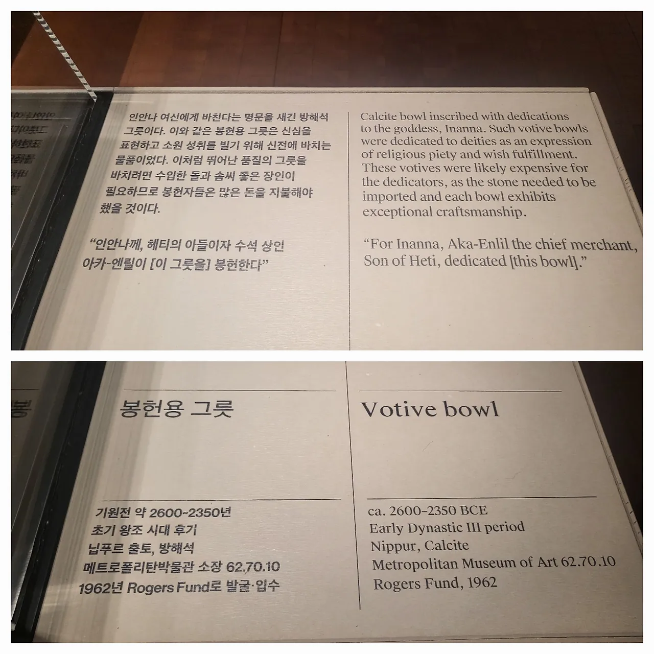메소포타미아(현재 이라크가 있는 티그리스강과 유프라테스강 사이 비옥한 지대) 문명을 알 수 있는 유물을 전시하였다고 하여 국립중앙박물관을 찾았다. 먼저 입구에는 여신에게 바치는 그릇과 조각상이 있었다. 그릇과 조각상을 만들기 위해서는 장인에게 돈을 주고 만들었을 것이라고 한다. 그릇 뒤에는 '어디 사는 누가 바칩니다.'라는 글귀가 있다. 우리도 절에 가서 기왓장을 사서 가족 이름과 주소를 적을 때가 있다. 기원전 2600년경에 살았던 사람들도 우리와 똑같은 생각을 하며 신에게 갈구하는 게 있었던 모양이다.