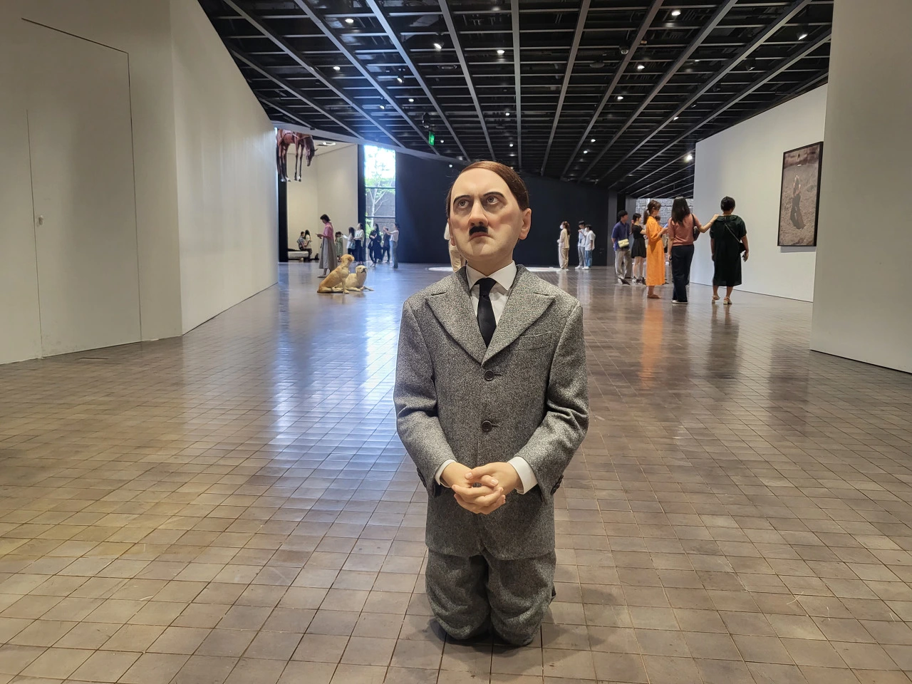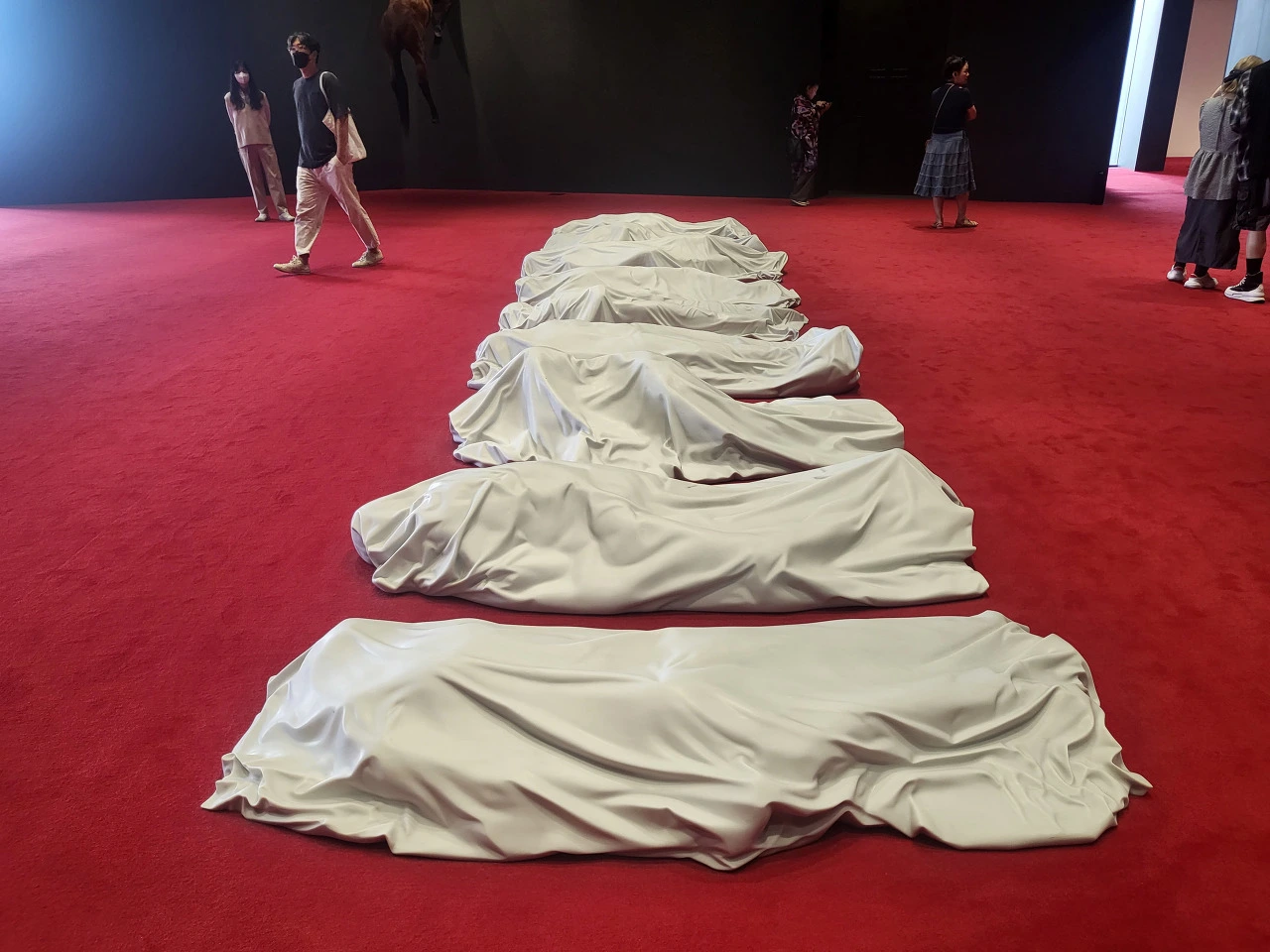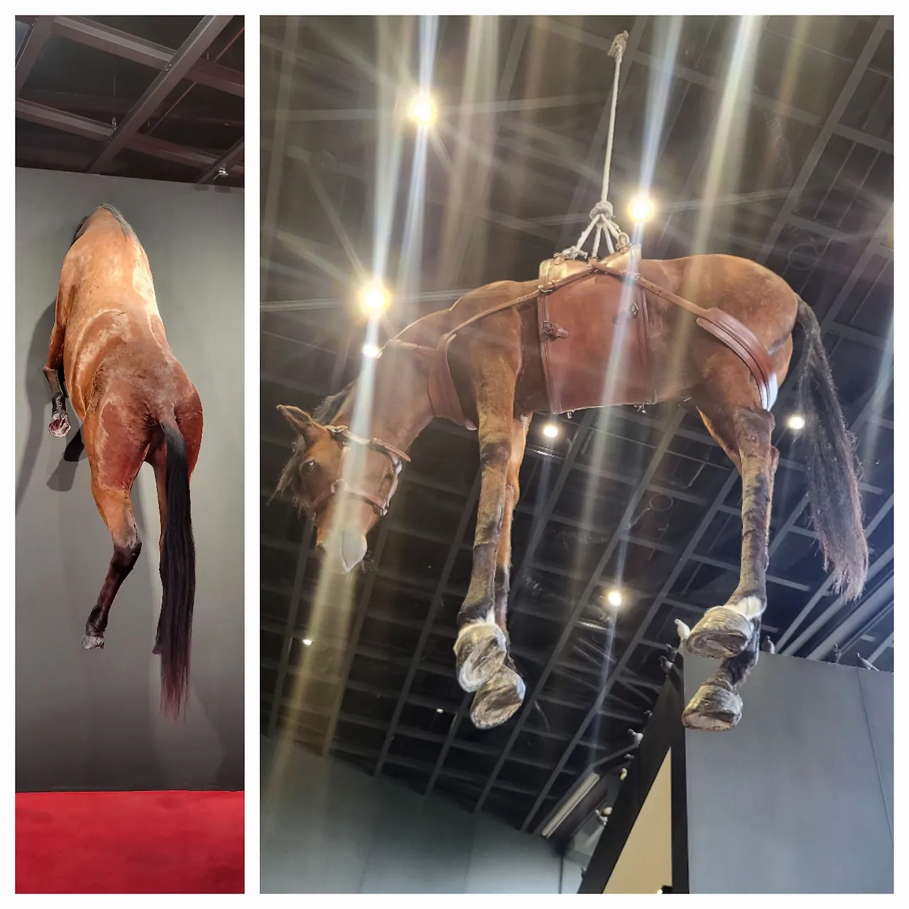 전시장 여기저기에 박제가 된 말들이 벽에 박혀 있거나 공중에 매달려 있다. 그냥 보는 것만으로도 오싹한 느낌이 든다. 바닥에는 천으로 덮인 시체를 연상시키는 대리석들이 있는데 그것 또한 죽음이다. 우리가 잊고 살고 있는 삶의 다른 한쪽인 죽음을 계속 떠오르게 한다. 침대에 누워있는 남자의 얼굴은 카텔란으로 보이는데 작가 자신의 죽음이자 동시에 우리들 역시 언젠가는 침대에 꼿꼿하게 누워서 이 세상과 이별할 거란 걸 말하는 듯하다. 이리저리 눈을 돌릴 때마다 가슴이 철렁하며 놀람의 연속이다. 신선한 자극이 이런 걸까. 익숙하지 않은 것들, 평소에는 피하고 싶은 것들을 자꾸 눈앞에 들이미는 것 같다.