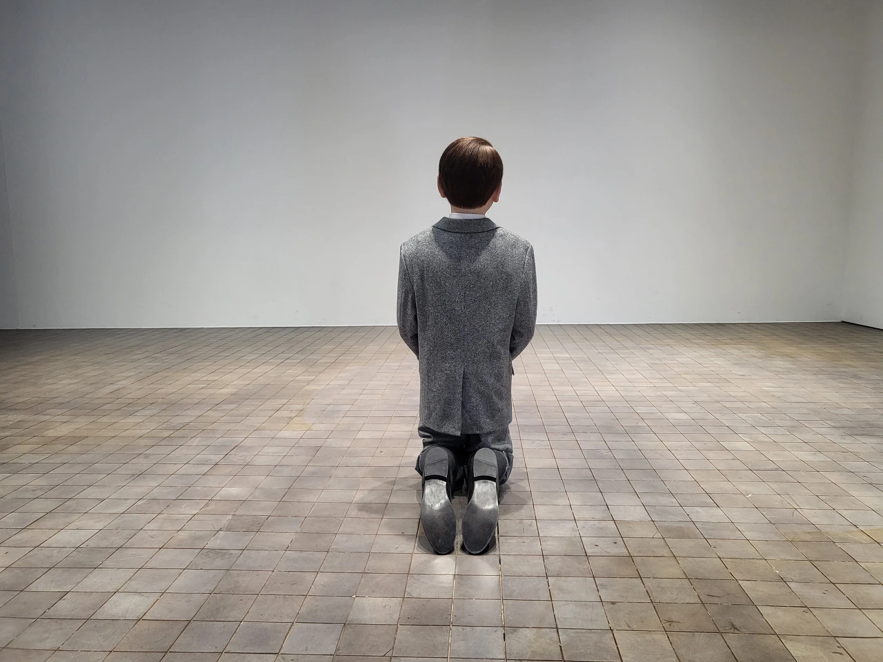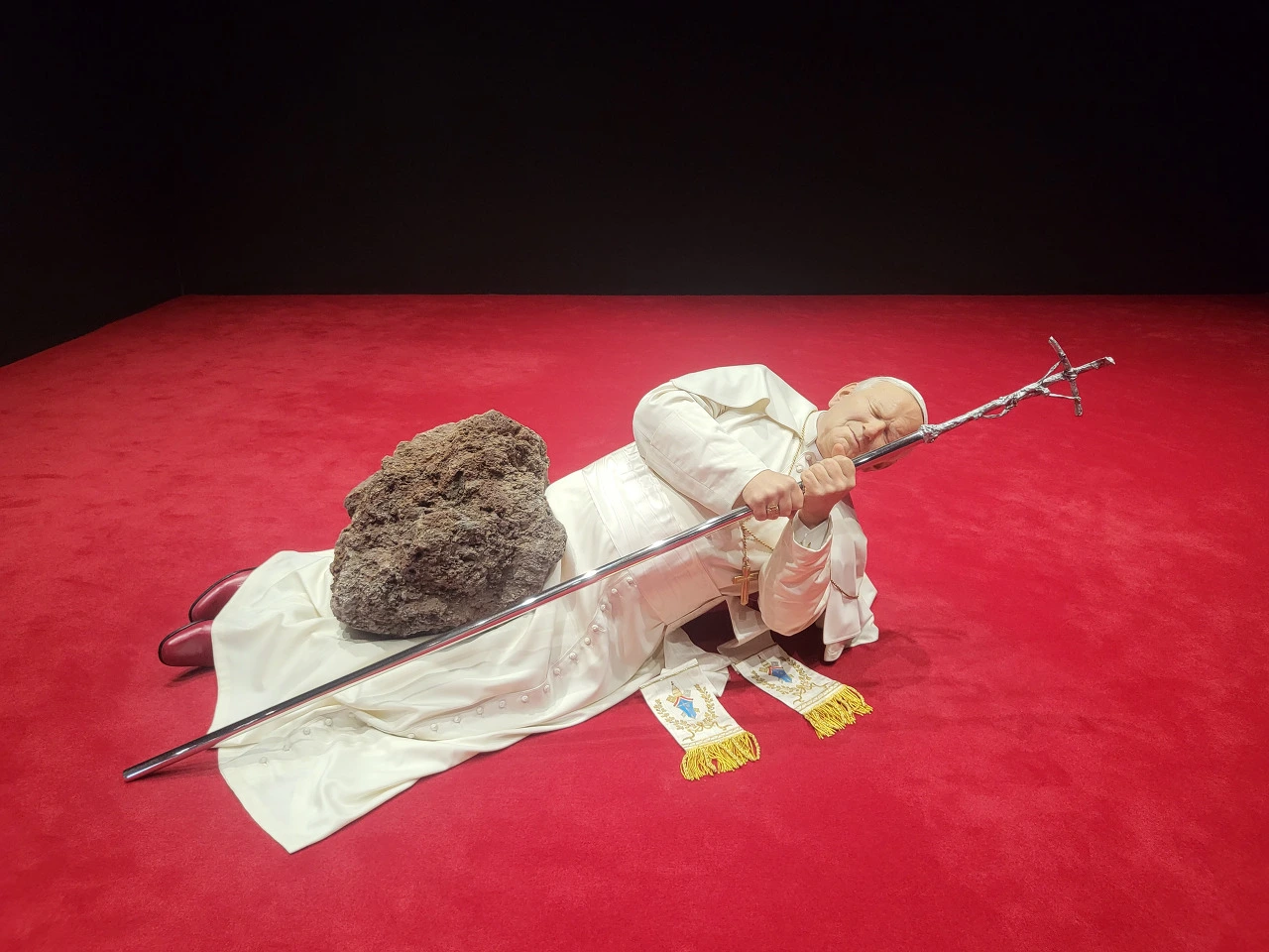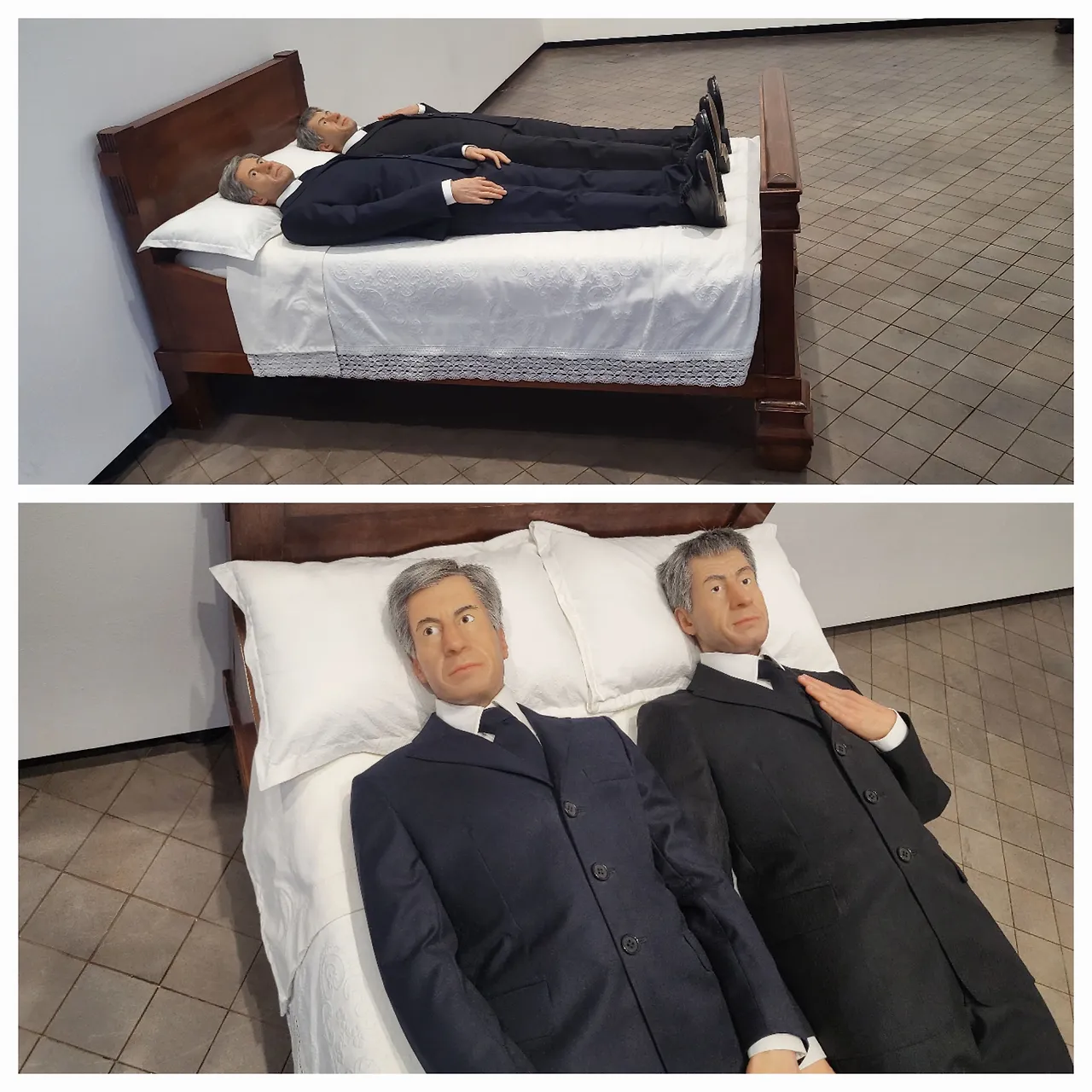 전시장 여기저기에 박제가 된 말들이 벽에 박혀 있거나 공중에 매달려 있다. 그냥 보는 것만으로도 오싹한 느낌이 든다. 바닥에는 천으로 덮인 시체를 연상시키는 대리석들이 있는데 그것 또한 죽음이다. 우리가 잊고 살고 있는 삶의 다른 한쪽인 죽음을 계속 떠오르게 한다. 침대에 누워있는 남자의 얼굴은 카텔란으로 보이는데 작가 자신의 죽음이자 동시에 우리들 역시 언젠가는 침대에 꼿꼿하게 누워서 이 세상과 이별할 거란 걸 말하는 듯하다. 이리저리 눈을 돌릴 때마다 가슴이 철렁하며 놀람의 연속이다. 신선한 자극이 이런 걸까. 익숙하지 않은 것들, 평소에는 피하고 싶은 것들을 자꾸 눈앞에 들이미는 것 같다.