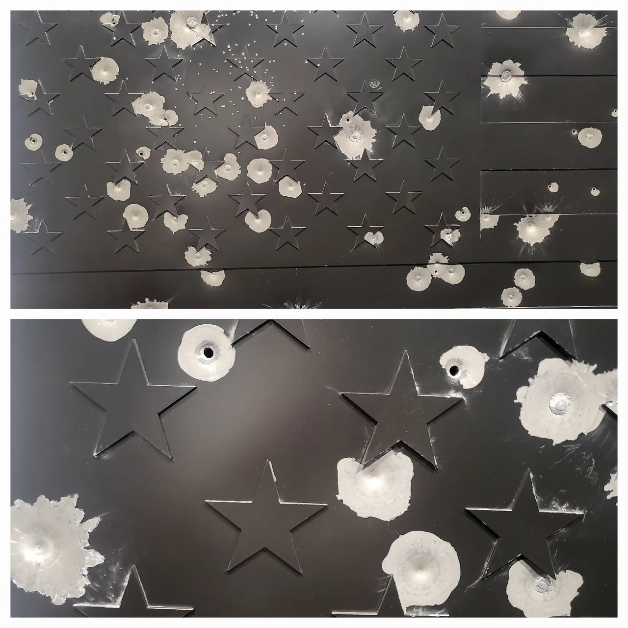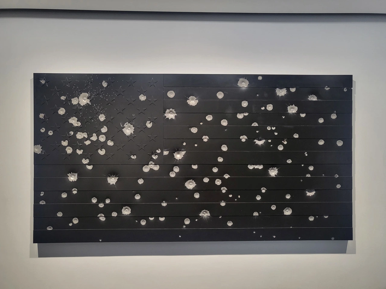 먼저 전시장 입구에 들어가니까 '브레멘 악대'를 소재로 한 브래맨 악대의 화석이 있었다. 화석을 보면 죽음을 연상하게 된다. 돌아서면 다시 미국 성조기가 검게 처리되어 있고 거기에 총탄 자국이 여기저기 흩어져 있다. 이것 역시 미국이 연일 총기사고로 희생당하는 사람들에 대한 경고가 아닐까.