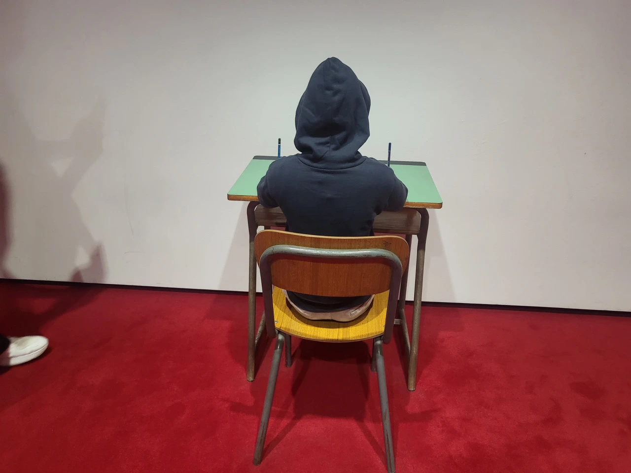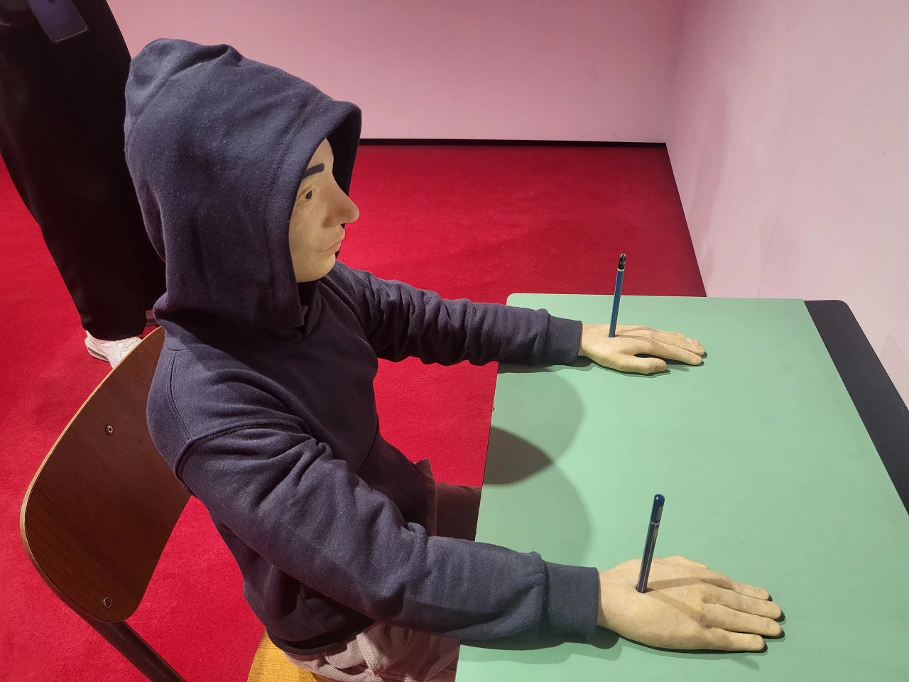 벽을 바라보고 앉아 있는 학생이 뭘 하고 있는지 궁금해서 다가가 보면 양손에 연필이 박혀있다. 학생이 학교에서 당하는 폭력들. 나무 의자에 앉아서 10시간씩 버티는 것 자체가 폭력이다. 공부 재능이 없는 아이에게 학교는 폭력이다. 참아야 되고 노는 시간 종이 날 때까지 버텨야 한다. 딱딱한 책상과 의자에서. 수업시간에 아예 잠을 청하거나. 잠자다가 어쩌다가 용감하게 깨우는 선생님에게 대들거나. 깨우지 못하는 선생님은 스스로 권위를 내세우지 못해서 상처받고.