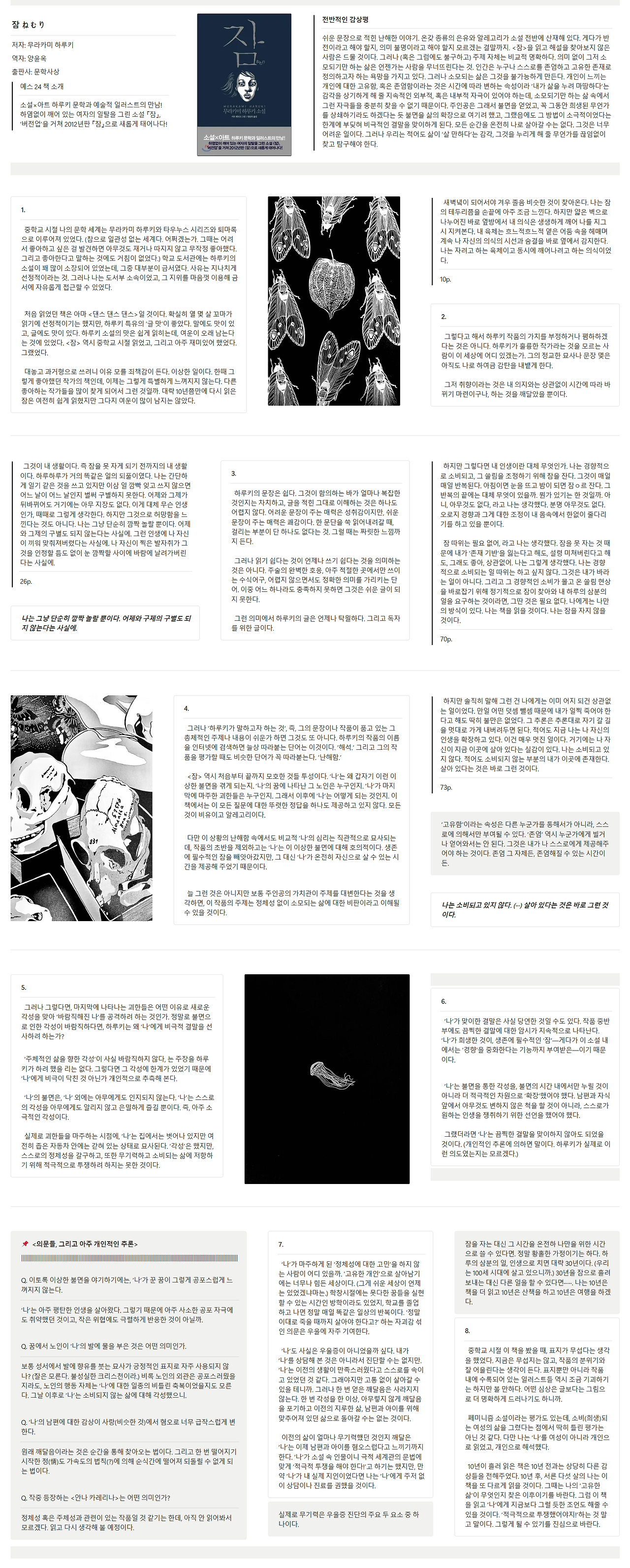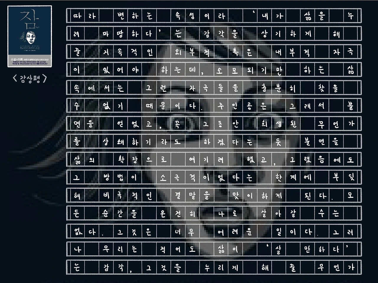 대놓고 과거형으로 쓰려니 이유 모를 죄책감이 든다. 이상한 일이다. 한때 그렇게 좋아했던 작가의 책인데, 이제는 그렇게 특별하게 느껴지지 않는다. 다른 좋아하는 작가들을 많이 찾게 되어서 그런 것일까. 대략 10년쯤만에 다시 읽은 잠은 여전히 쉽게 읽혔지만 그다지 여운이 많이 남지는 않았다.