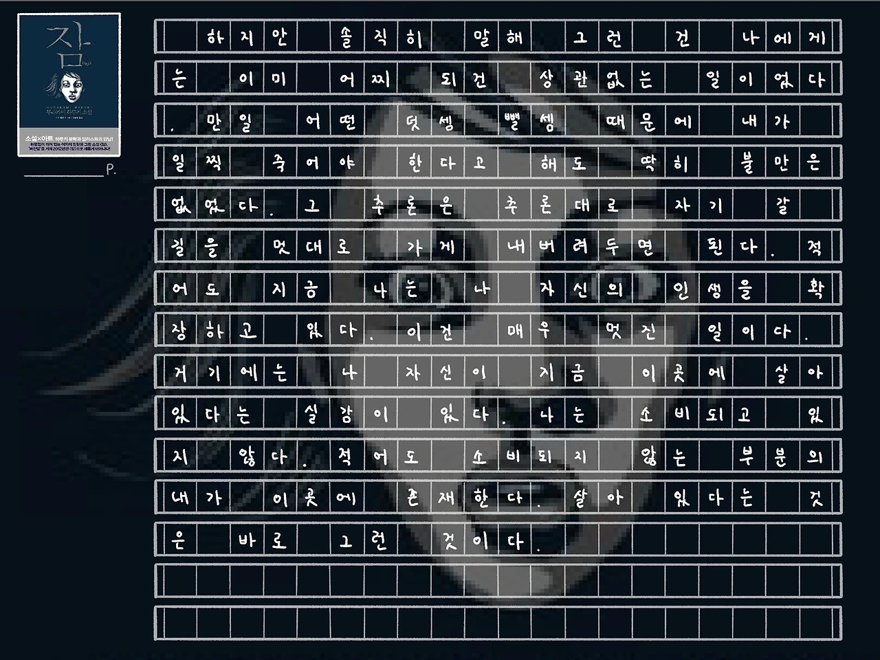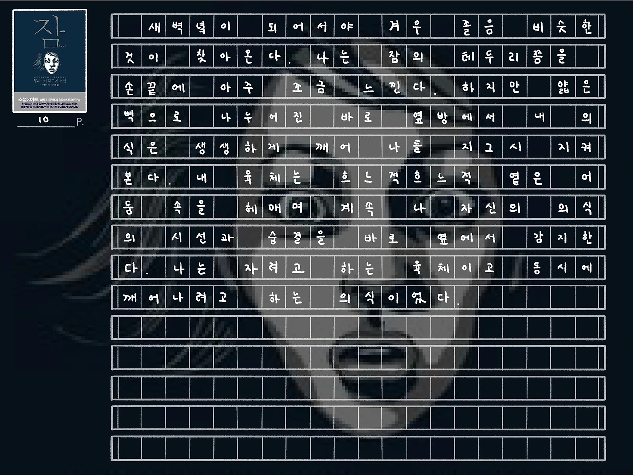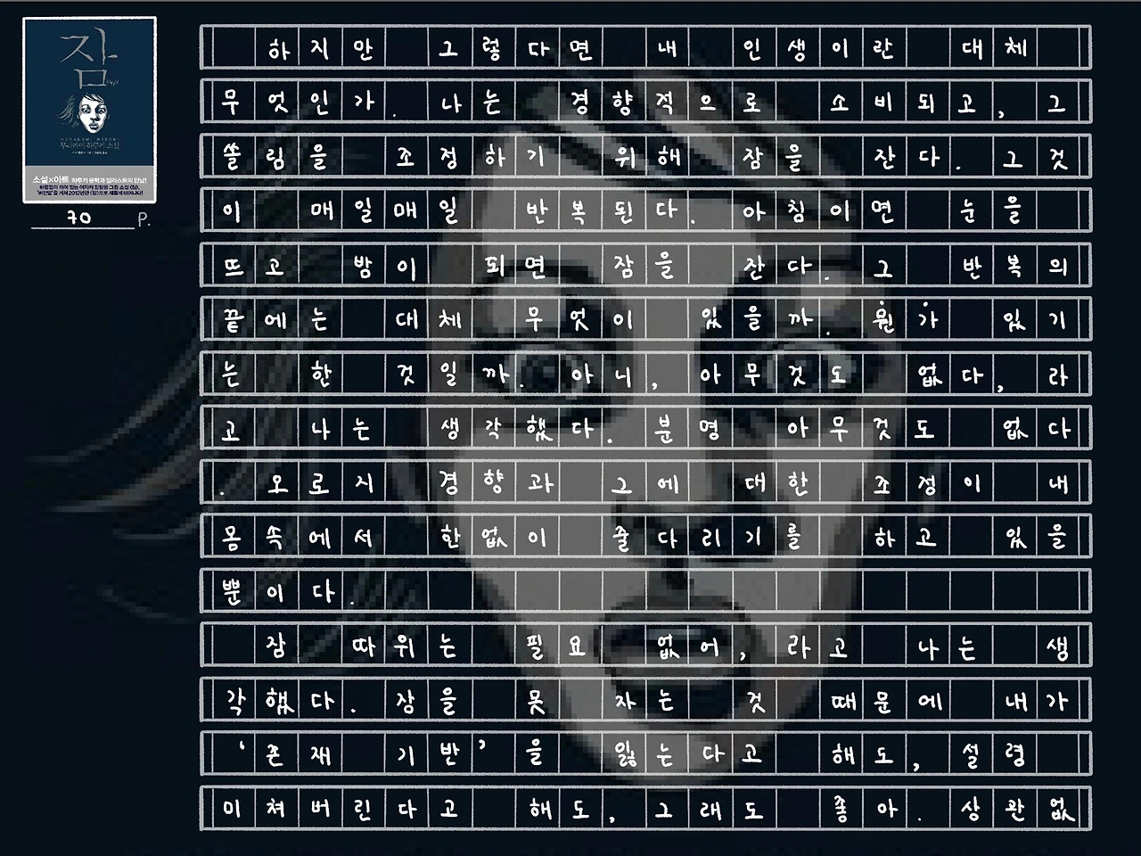 <잠> 역시 처음부터 끝까지 모호한 것들 투성이다. ‘나’는 왜 갑자기 이런 이상한 불면을 겪게 되는지. ‘나’의 꿈에 나타난 그 노인은 누구인지. ‘나’가 마지막에 마주한 괴한들은 누구인지. 그래서 이후에 ‘나’는 어떻게 되는 것인지. 이 책에서는 이 모든 질문에 대한 뚜렷한 정답을 하나도 제공하고 있지 않다. 모든 것이 비유이고 알레고리이다.