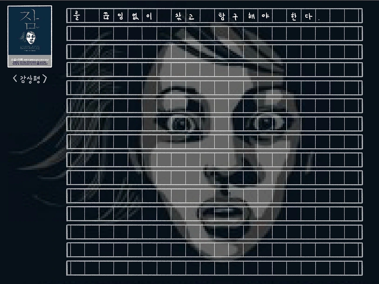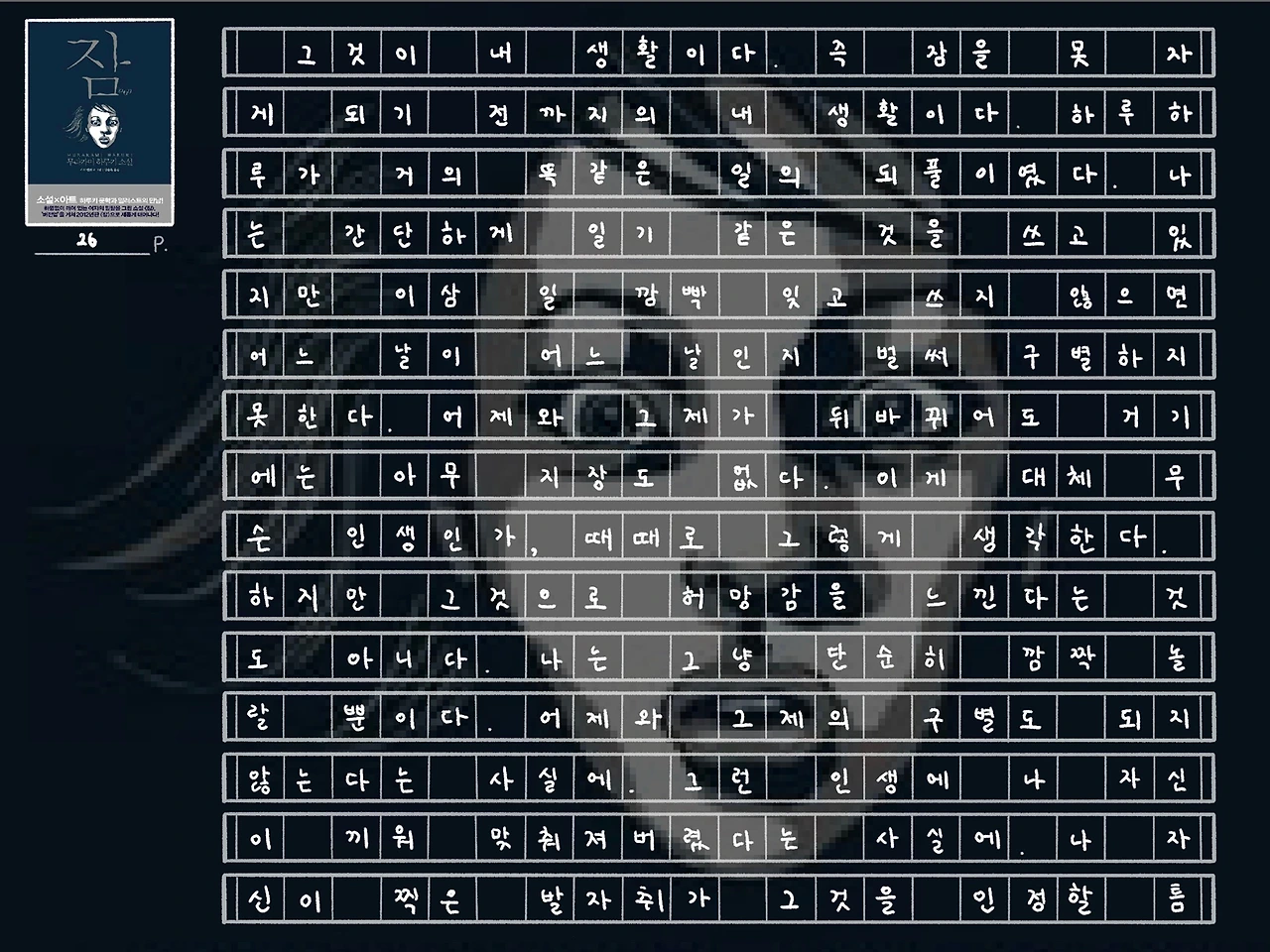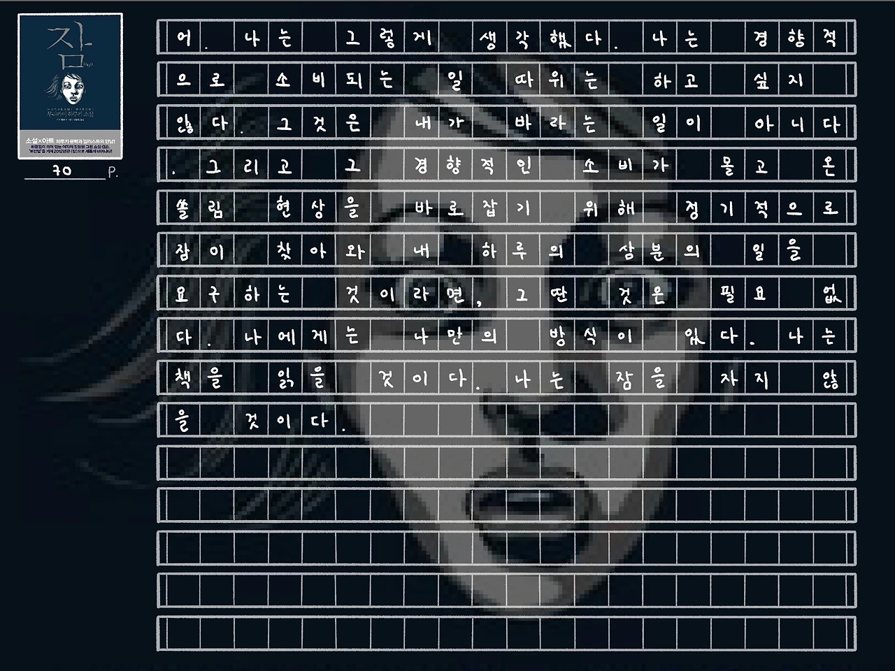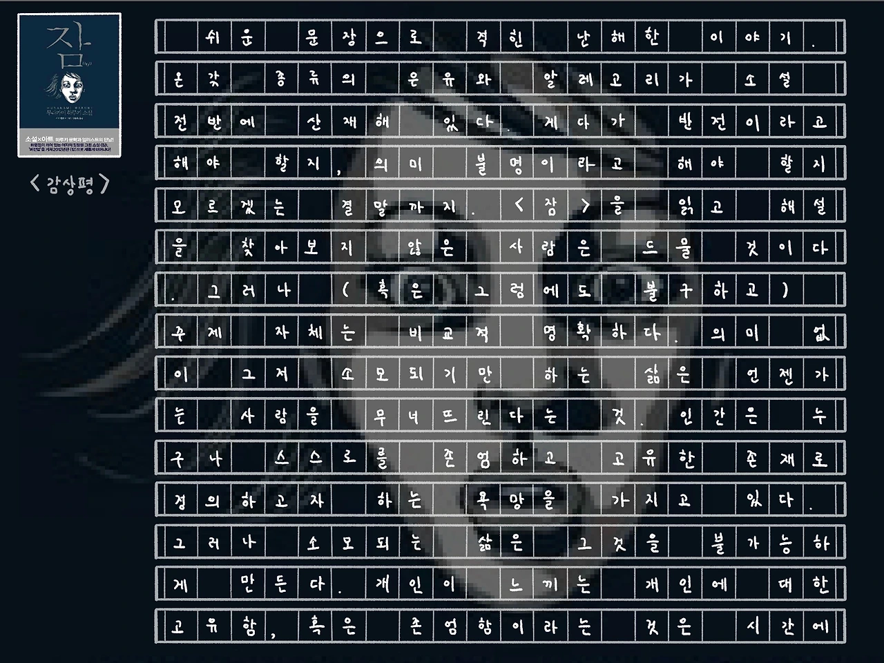 <잠> 역시 처음부터 끝까지 모호한 것들 투성이다. ‘나’는 왜 갑자기 이런 이상한 불면을 겪게 되는지. ‘나’의 꿈에 나타난 그 노인은 누구인지. ‘나’가 마지막에 마주한 괴한들은 누구인지. 그래서 이후에 ‘나’는 어떻게 되는 것인지. 이 책에서는 이 모든 질문에 대한 뚜렷한 정답을 하나도 제공하고 있지 않다. 모든 것이 비유이고 알레고리이다.