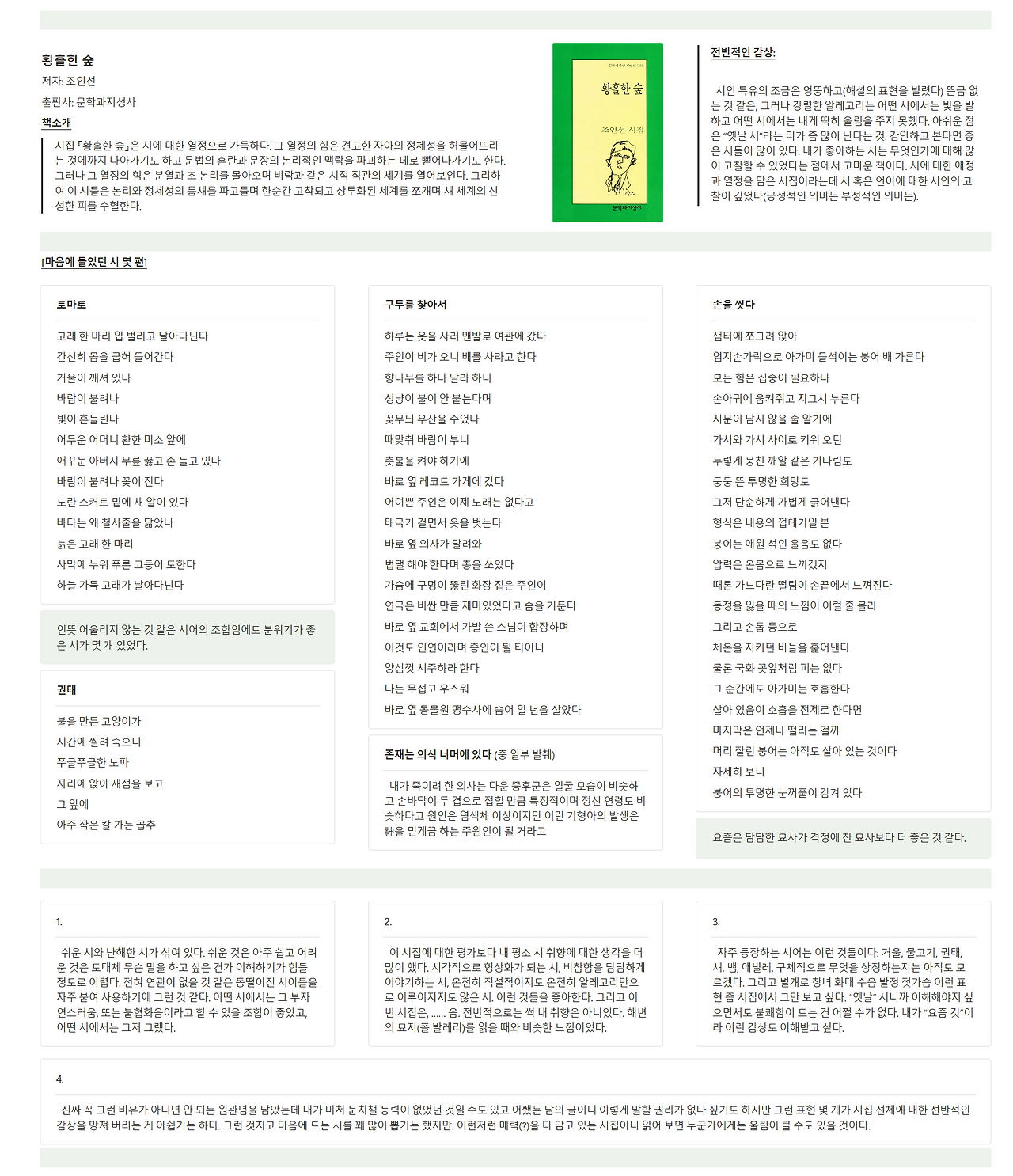 이 시집에 대한 평가보다 내 평소 시 취향에 대한 생각을 더 많이 했다. 시각적으로 형상화가 되는 시, 비참함을 담담하게 이야기하는 시, 온전히 직설적이지도 온전히 알레고리만으로 이루어지지도 않은 시. 이런 것들을 좋아한다. 그리고 이번 시집은, …… 음. 전반적으로는 썩 내 취향은 아니었다. 해변의 묘지(폴 발레리)를 읽을 때와 비슷한 느낌이었다.