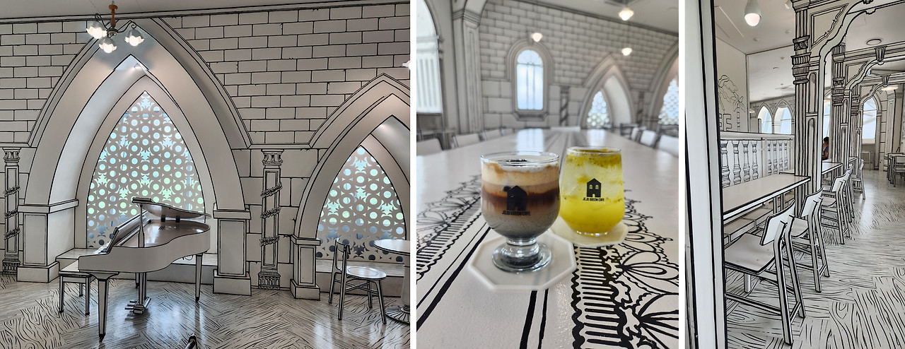 오설록 티뮤지엄은 정원과 녹차밭이 유명한 곳인데 맛있는 음료를 마시며 여유롭게 쉬기 좋은 곳이었다. 녹차 와플 오프레도를 먹으면서 다음 코스를 찾기로 했다. 조식을 많이 먹어서인지 배가 안 꺼져서 소화시킬 겸 걸을 수 있는 곳을 찾아보니 근처에 그림카페라는 곳이 있었다. 이색적이기도 하고 걸어갈 수 있는 곳이라서 가기로 했다. 막상 가보니 사진처럼 이색적이긴 했는데 뭐랄까? 사진만 봤어도 되는 그런 느낌이었다.
