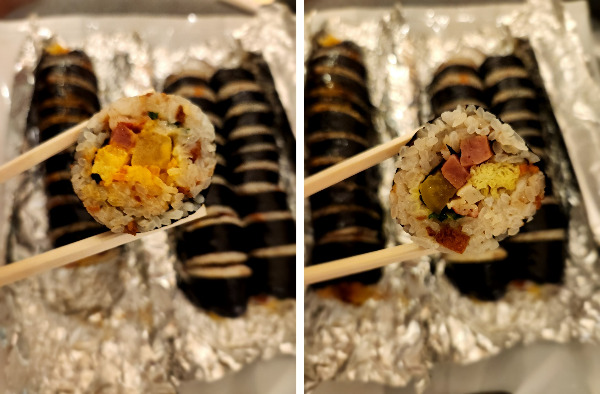 김밥 하나에 우리는 행복해졌고, 시장 구경을 하고 호텔로 복귀했다. 이른 저녁을 먹고 걸어서인지 배가 꺼져 바로 김밥을 맛봤다. 간이 센 보통 김밥이었는데 중독적인 맛이 있었다. 어느새 한 줄을 뚝딱하고 멸치 김밥을 먹었는데 멸치 김밥은 그냥 그랬다. 근데 다른 김밥들도 먹어보고 싶어 졌고 다음에 오면 또 먹고 싶다는 생각도 들었다. 괜히 김밥 하나로 건물을 세운게 아닌 듯싶었다. 돼지고기와 김밥으로 즐거운 저녁을 보낸 여행 둘째 날이 기분 좋게 마무리되고 있었다.