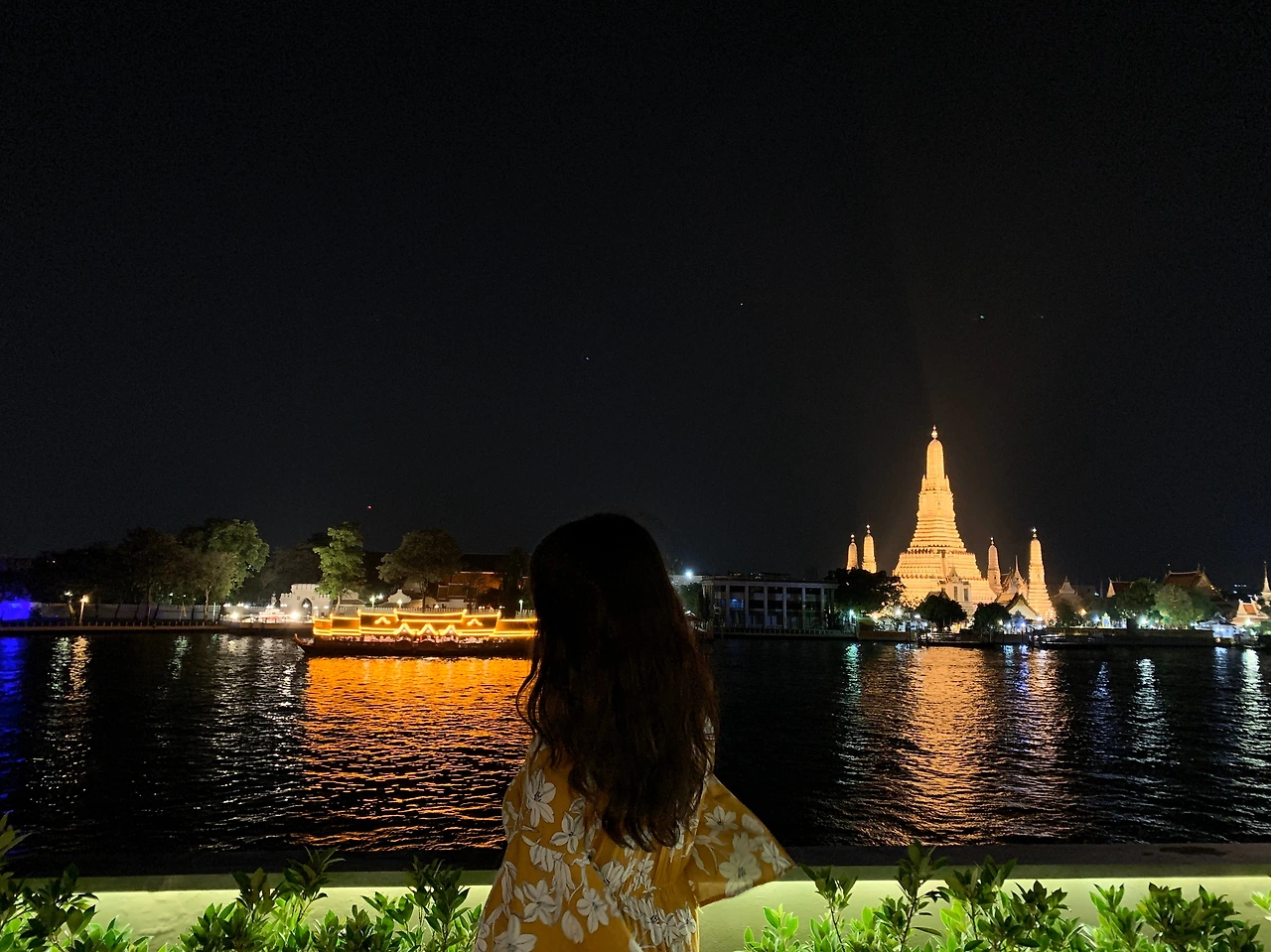 이곳에 오기까지의 과정들을 까맣게 잊고 마치 순간이동을 한 것처럼 떡 하니 이 공간에 이 생경한 곳에 놓인 거 같은 기분이 들었다. 카오산 로드샵에서 산 노란색 원피스를 맞춰 입고, J가 한국에서 미리 예약한 왓 아룬이 보이는 레스토랑에 앉아 있던 이 순간이 궤도를 이탈한 비현실 같았다. 금빛에 둘러싸인 왓 아룬이 멀리서 보이고 뜨거움이 물러간 공기가 선선했고, 잔잔하고 고요한 강이 흐르는 풍경 안이었다. 열 손가락이 접히도록 그녀와 떠나온 여행들이 삶 곳곳에 흐른다. 그런 J와 비현실 같은 오늘, 다시 테이블에 마주 앉았다. 짠맛이 도는 음식과 맥주를 잔에 따르면서 이런 시간을 또 가짐에 무한히 감사하고 감사했다. 가고 싶고, 보고 싶을 때 떠나 올 수 있어- 가능케 해준 가족과 친구와 시간과 물질... 모든 순간들에 눈물겹게 감사했다.