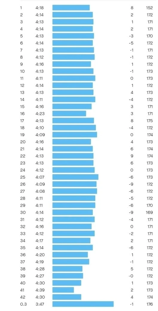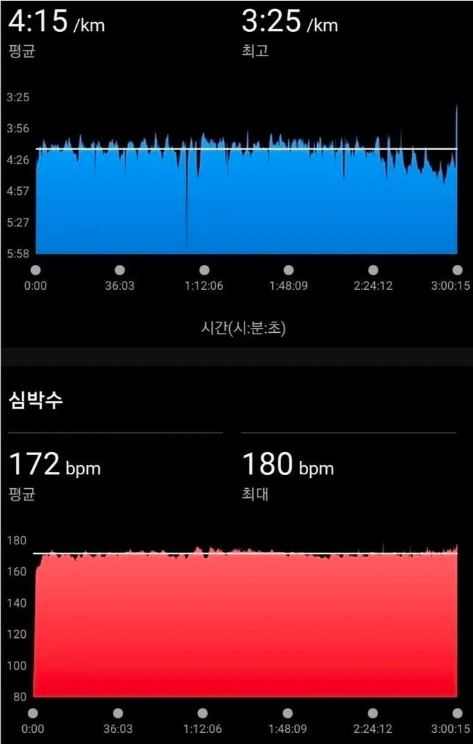 하지만 36km 지점에서 오른쪽 햄스트링에 통증이 느껴졌다. 참고 달릴만한 수준의 통증이지만 신경 쓰이는 건 어쩔 수 없었다. 피니쉬 지점까지 6km가 남은 시점이기에 420으로 낮추었는데 38km 마지막 오르막에서 통증은 더 심해졌고 페이스는 430까지 빠졌다. 다리는 잠기기시작했고 그 와중에 계산을 해보니 아슬아슬하게 3시간 안쪽으로 들어올 수 있을 것 같았다.