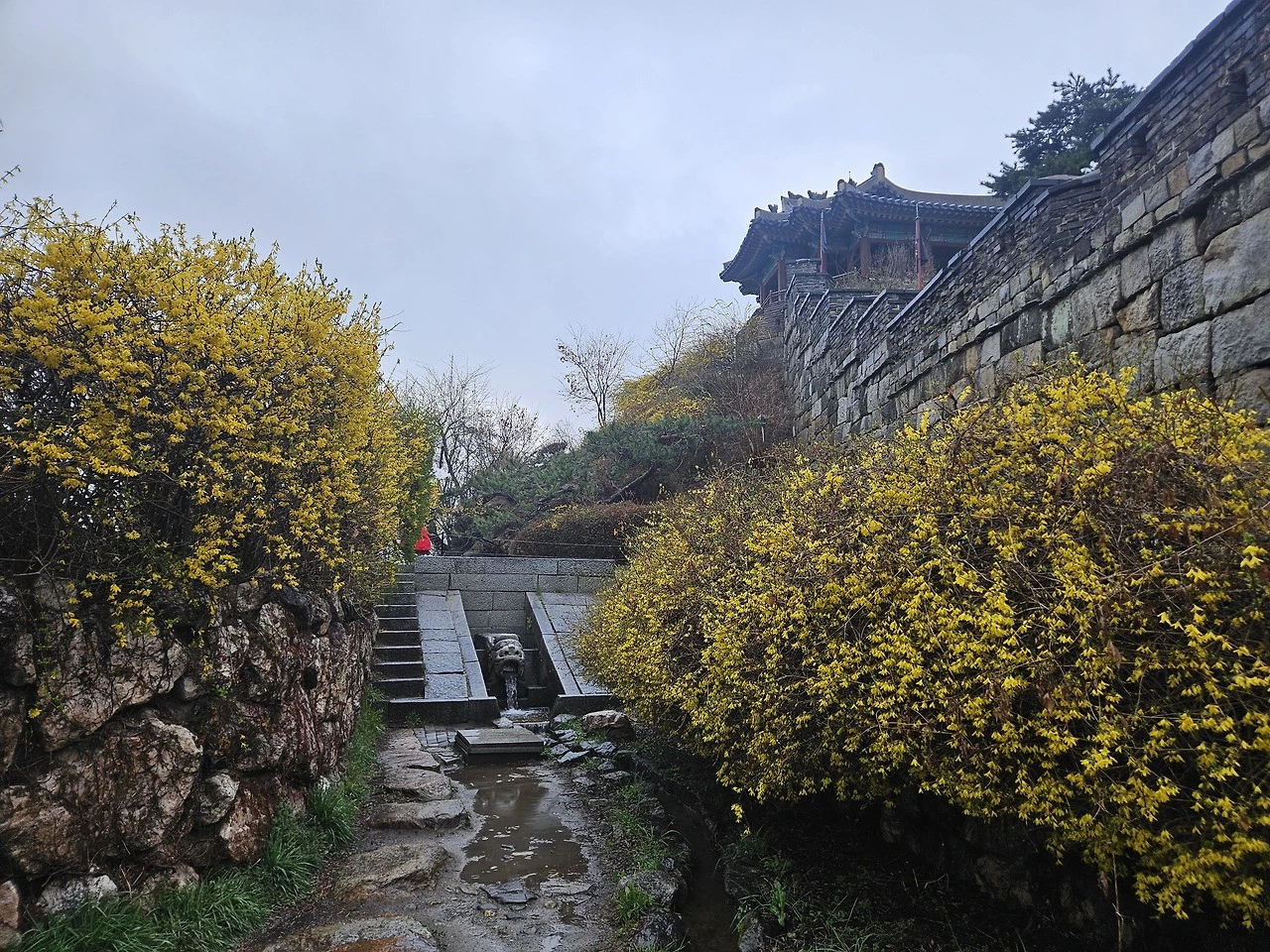 방화수류정 아래에는 노란 개나리가 활짝 피었고 더러는 지고 있었다. 완연한 봄이 왔고 봄이 지나가고 있음을 알려주었다. 비가 머문 자리, 성곽에 가만히 손을 대어 본다. 빗물에 젖어 차가웠지만 따뜻함으로 내 가슴에 남았다.