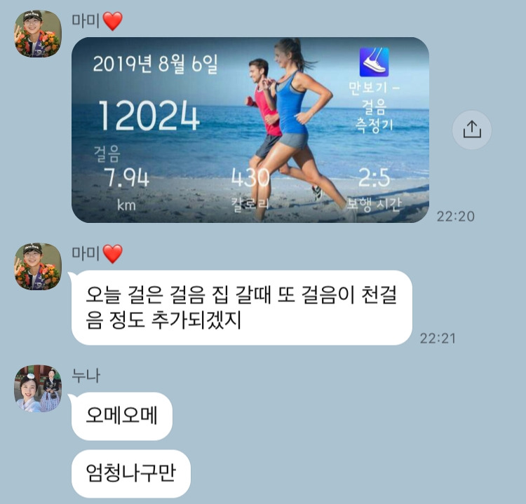 변화가 하루아침에 있었던 것은 아니지만 처음엔 많은 걸음수를 지치는 것으로만 생각했던 엄마가 어느 날부터는 자랑스럽게 ‘오늘도 이만큼이나 걸었네!’라고 연락이 왔다.