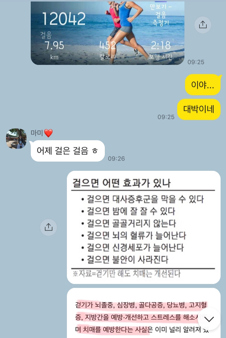 예전에는 피곤을 토로하시던 어머니가 언제부터인가 당신께서 이만큼이나 걸었다며 걷기에 대해 긍정적 인식을 하시고 가족 단톡방에 ‘걷기 인증’을 하기 시작하셨다. 그럴 때마다 더욱 격려해드리고 걷기의 긍정적 효과를 얻으실 수 있도록 같은 걷기 효과 이미지를 보내드렸다.
