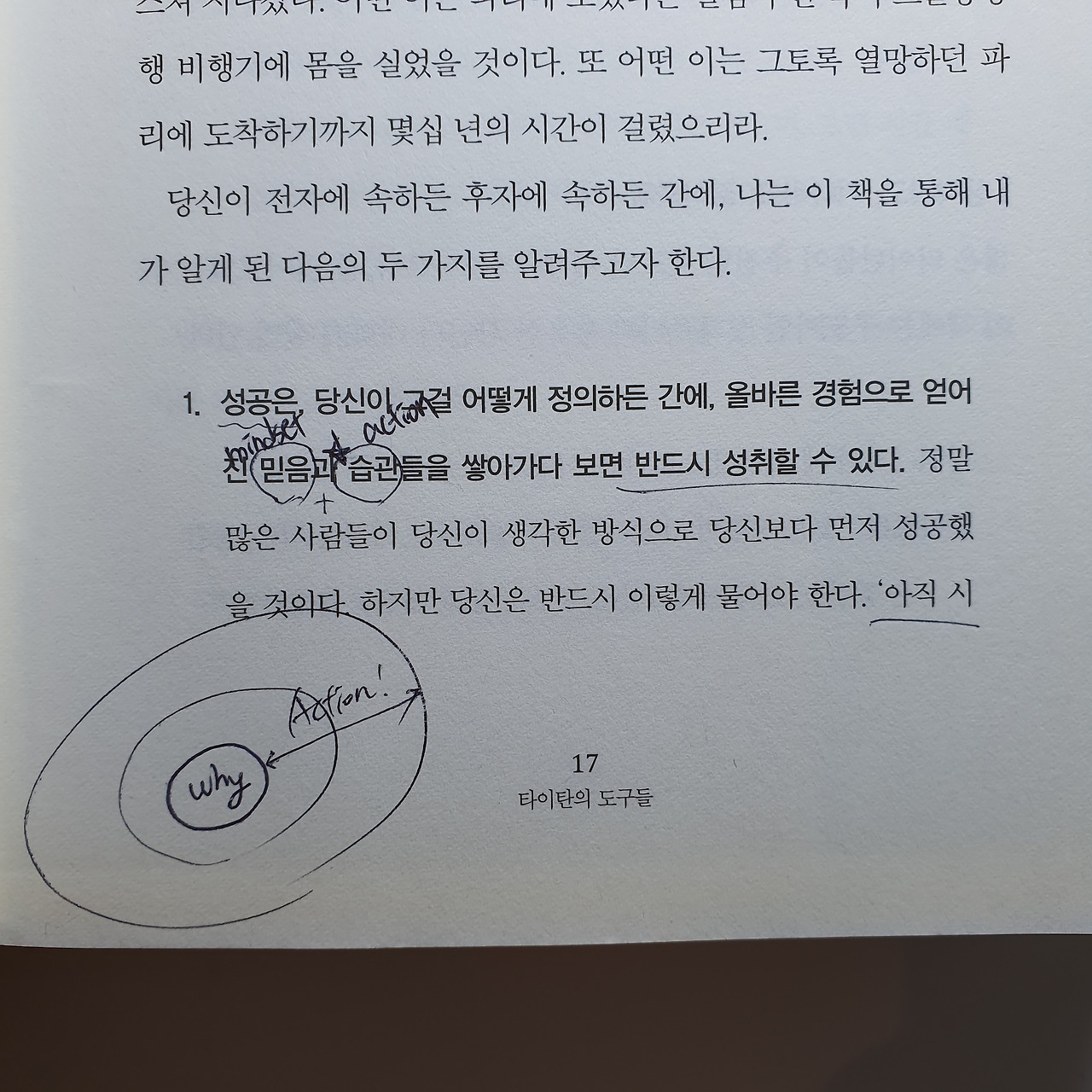 따라서 <타이탄의 도구들>과 같은 종류의 책을 읽을 때는 단 하나라도 실천을 하는 것에 방점을 두기를 권한다. 그렇다면 몇 년 전에 사서 모퉁이가 여러군데 접힌 이 책이 내 인생을 어떻게 바꿨는지 하나씩 살펴보자.