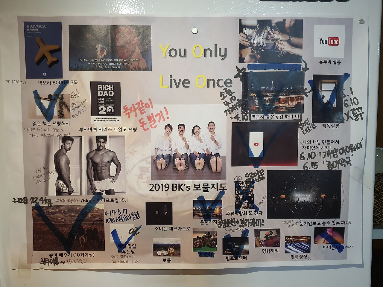 시각화가 좋다는 것은 두 말하면 입 아프다. 시각화가 당신의 무의식까지 영향을 미치고 목표를 달성하기에 좋다는 데이터는 셀 수 없이 많다. 그러니 시각화의 효과에 의문을 가질 시간에 하나라도 더 시각화해라. 나는 개인적으로 보물지도 라는 것을 별 일 없으면 매 년 만든다. 보물지도는 나의 목표를 시각화한 것이다. 그리고 냉장고나 내 방의 벽처럼 가장 자주 눈에 띄는 곳에다 붙여둔다. 그러면 그 목표는 인셉션처럼 내 무의식에 스며든다. 해운대에서 광안리로 가는 요트안에서는 내가 술을 마시든 음악을 들으며 춤을 추든 요트는 광안리로 간다. 어떤 순간에도 나의 마인드가 내가 가고자하는 방향으로 향하고자 한다면 시각화로 당신의 뇌를 속여라.