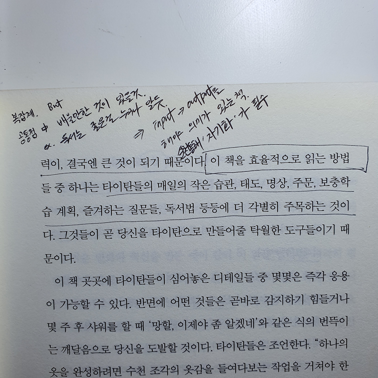 이런 종류의 책을 읽다보면 ‘나다움’을 잃기 십상이다. 나 자신을 비운채 타이탄들의 61가지 전략을 복제해야 될 것 같으니까. 단연코 그렇게 할 필요 없다. 책 한 권을 통해 하나의 시도만 있어도 책 값과 거기에 들어간 시간은 번 것이다. 텍스트를 읽는 것에 집착하지 마라. 그렇게 61가지를 씹어 먹으려 하다 체하고 소화도 안 된다.