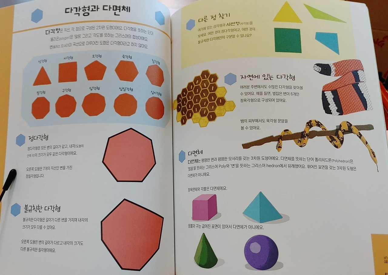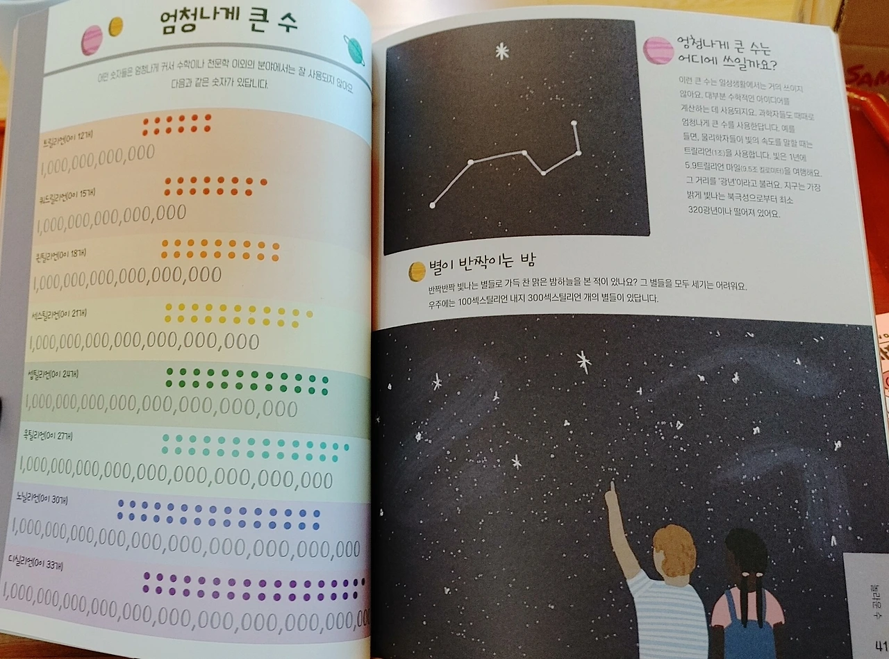6살 난 작은 아이는 숫자를 좋아해서인지 형님 책인데도 제거마냥 책을 펼쳐보곤 했다. 특히 우주그림과 함께 숫자 0이 많이 나온 '엄청나게 큰 수'나, 다각형등을 재미있게 보았다.