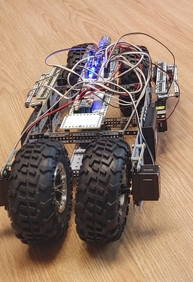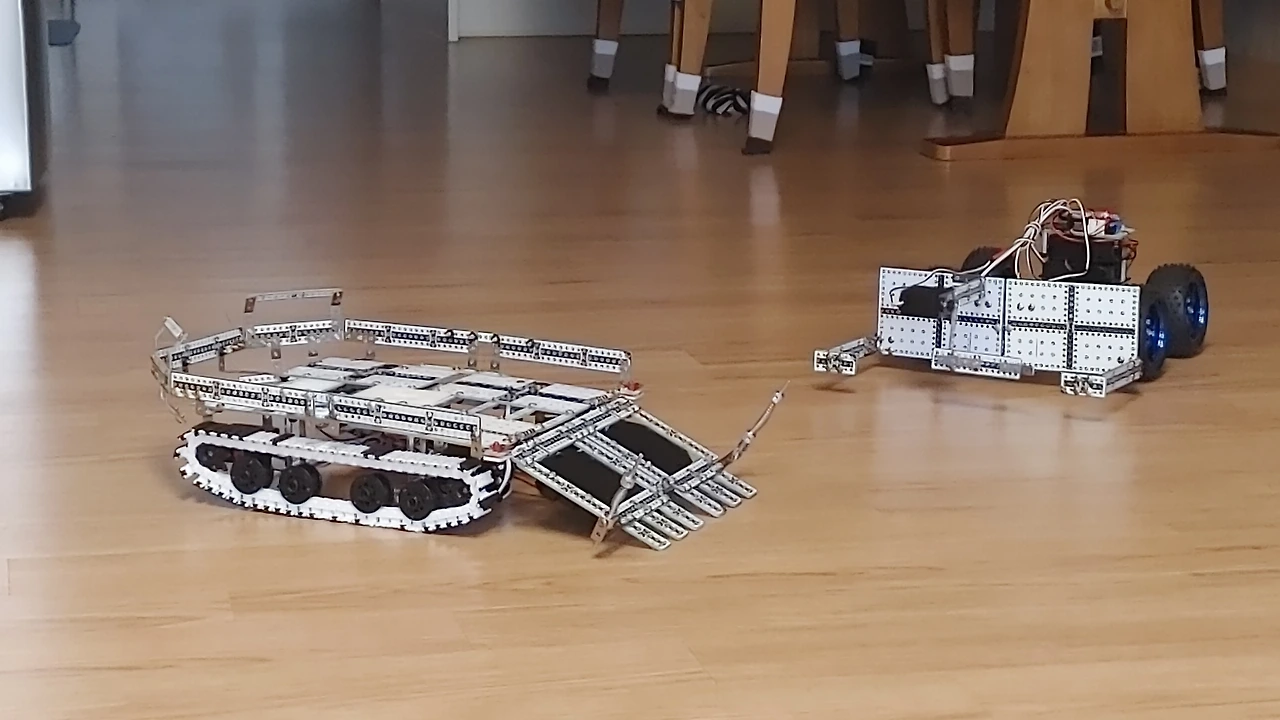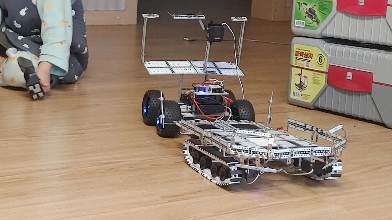 큰 아이가 만든 캐리어로봇과 창작 축구 로봇. 두 개의 리모컨으로 캐리어에 축구로봇을 태우는 중이다.