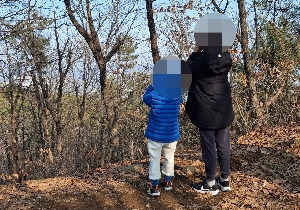 어리둥절, 황당, 안절부절을 거쳐 겨우 작은 아이가 정신을 차릴 때쯤에는 이미 용마산 정상으로 가는 중간쯤이었지요. 헬기가 다가오니 아이 둘다 약속한 듯 쌍안경을 꺼내듭니다.