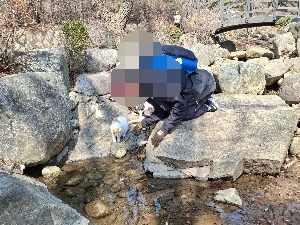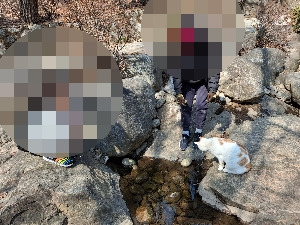 한참동안을 휘젓으며 잠시 얼굴을 비추고 사라진 도롱뇽을 찾아보았지만, 도롱뇽들도 고영희님에게 점심거리가 되기는 싫었던 모양이지요. 끝내 두 번은 모습을 보여주지 않아 한참을 막대기만 휘젓다가 고양이들과도 작별하고 다시 산행을 시작합니다.
