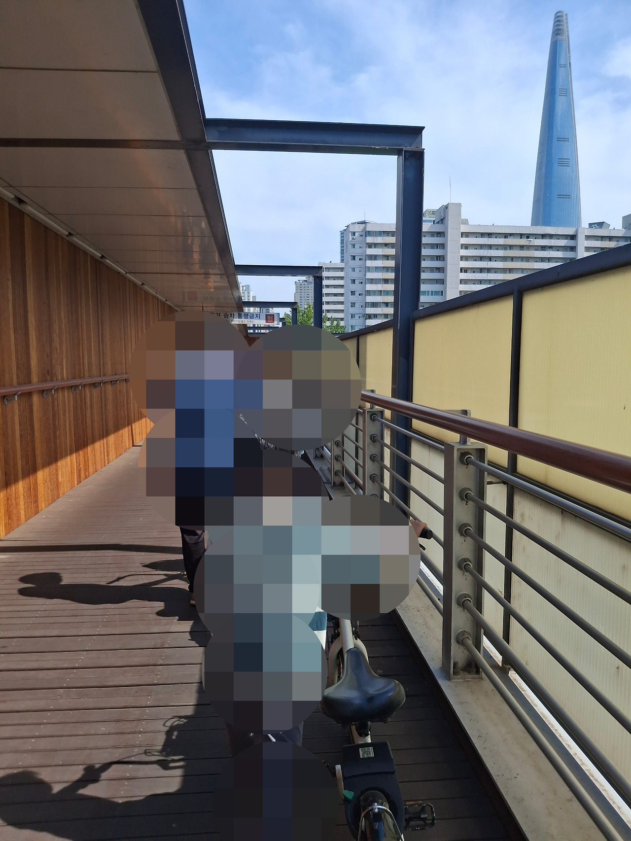 막히는 길에 가다서다를 반복하는 차량들을 뒤로 하고 달리다보면 어느새 잠실철교 위 자전거도로와 연결되는 길이 나옵니다. 이런 길도 있었나?의아했는데 지하철로만 연결된 잠실 철교 옆에 자전거도로와 보행로가 연결되어 있어 이동이 편하더라구요. 송파구 주민의 강 저편 이동도 가능하고,