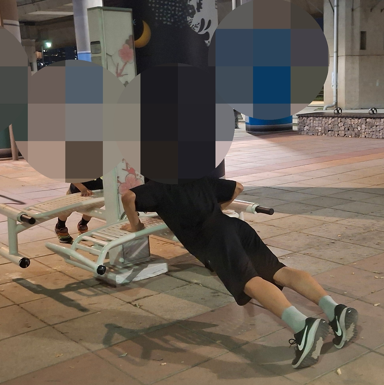 출발점에 돌아와서도 두 아이들의 에너지가 여전히 남아있었던지라 바로 집으로 가지 않고 한참동안 운동기구로 몸을 풀어주었습니다.