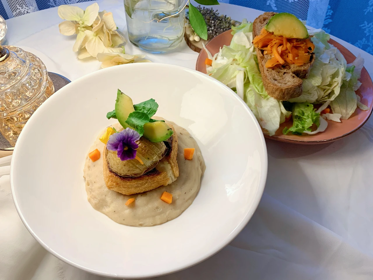 사실 이 요리의 가장 윗부분에 있는 감자는 장식용으로 만든 감자 프라이인데 수프와 스테이크 모두 식감이 부드러워 상대적으로 단단한 감자 프라이가 잘 어울렸다. 껍질째의 감자를 1/3 정도 잘라 끝까지 자르지 않고 칼집을 아코디언으로 낸 후 프라이팬에 잘 익혀주면 된다. 적당히 익힌 후 온도를 높여 겉 부분은 바삭하게 튀겨주면 되고 기름을 털어내고 식힌 후에 잎채소나 아보카도 같은 것들을 사이사이에 끼워 장식하면 된다.