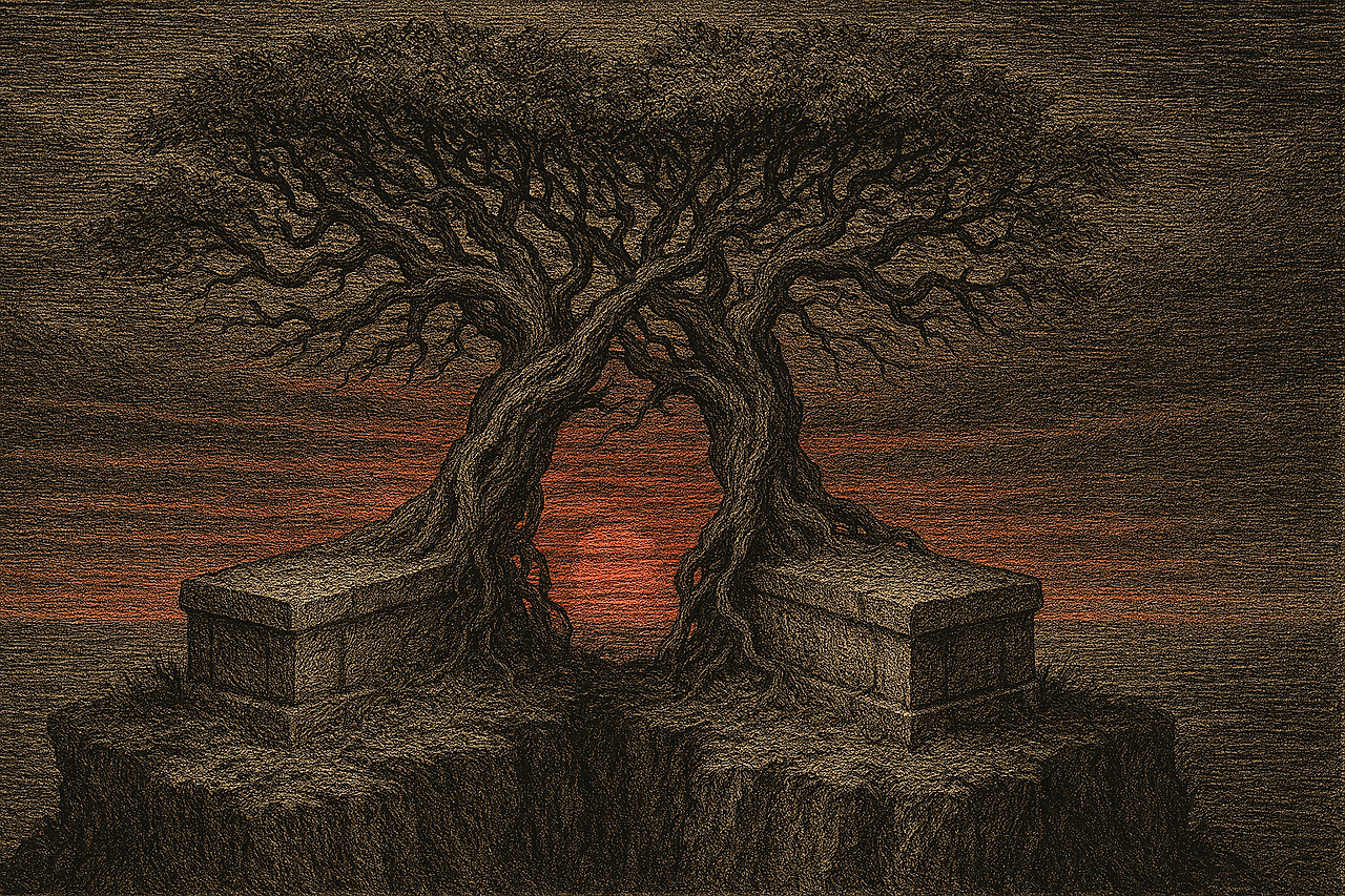 명리학적으로 이것은 '지지 육합(地支 六合)'의 물상입니다. 천간(하늘/정신)에서는 찢어졌으나, 지지(땅/현실)인 무덤 속에서 뿌리가 엉켜 비로소 합을 이룬 것입니다. 살아서는 원진(怨嗔)이었으나, 죽어서야 비로소 육합이 되었습니다.