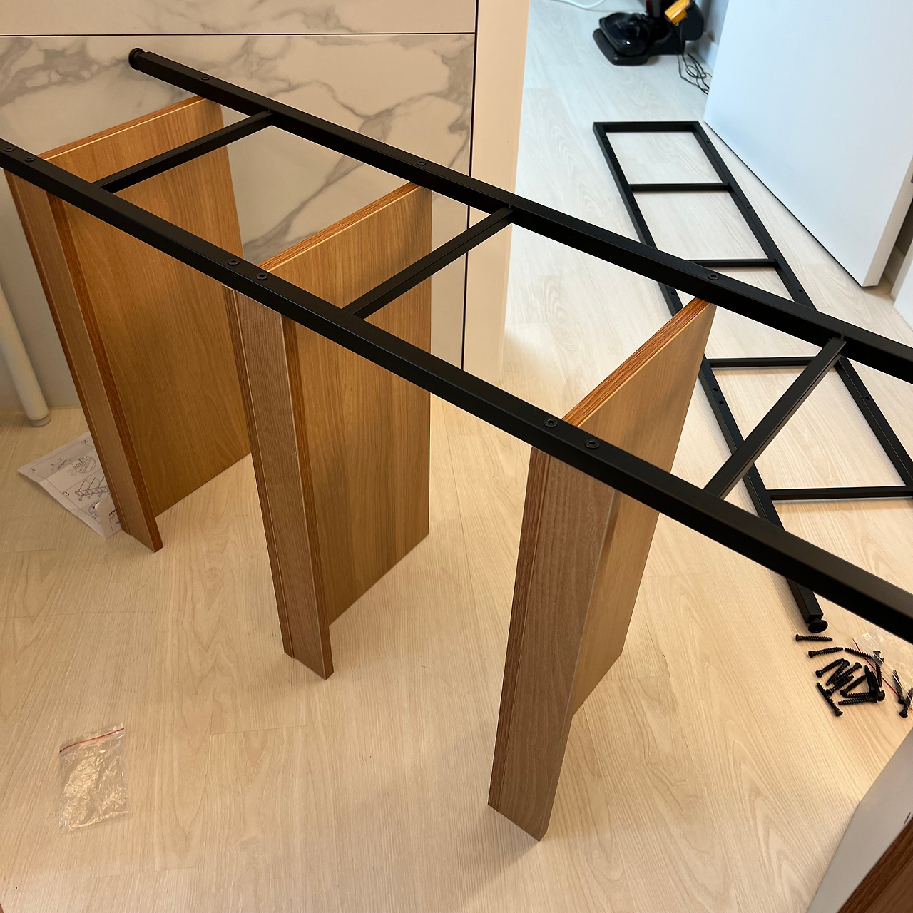 처음에 이걸 언제 다하지.. 했던 생각을 접고, 일에 집중하다 보니 어느새 절반은 온 것 같다. 나사못 개수만큼 육각 렌치를 돌려야 하니 거의 40번 정도 나사를 조인 것 같다. 오른손 엄지손가락이 살짝 부어올랐다. 가구 조립의 통과의례라고 생각하며 일에 다시 집중을 한다.