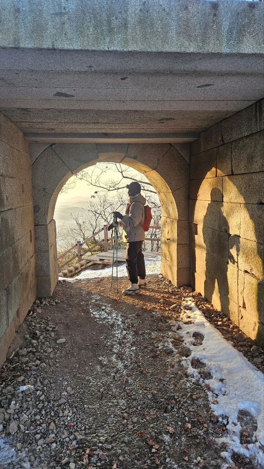 아침 7시, 아직 어둑한 하늘 아래 랜턴을 켜고 문수산 산림욕장 초입에 섰다. 안내판 앞에서 코스를 살폈다. 쉬운 1코스, 약 3.8km 거리의 산림욕장 산책로를 지나 전망대, 남아문, 중봉쉼터를 거쳐 정상까지 다녀오는 코스를 선택했다. 예상 소요 시간은 2시간 남짓. 준비해 온 아이젠과 스틱을 챙겨 신고, 길 위에 나섰다.