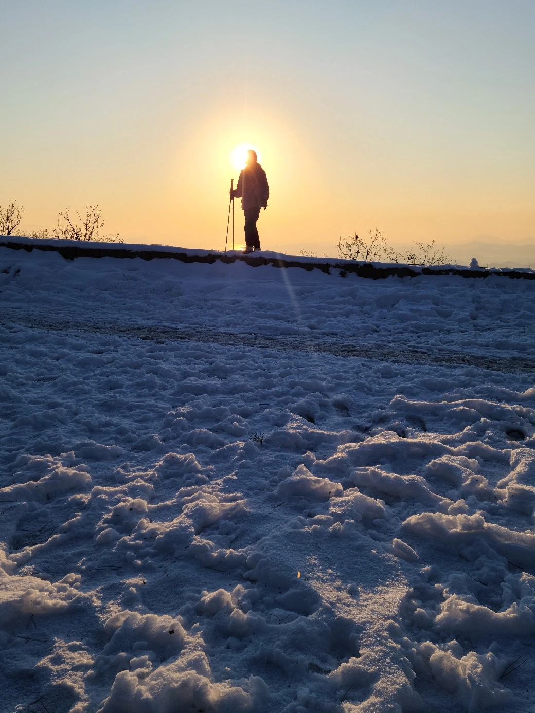 초반 30분은 늘 그렇듯 숨이 차고 다리가 무거웠지만, 마음은 가벼웠다. 빙판길로 미끄러질까 긴장하면서도, 공기가 코끝에 닿는 상쾌함에 저절로 미소가 번졌다. 그렇게 천천히 걸으며 풍경을 즐기다 보니 어느덧 전망대에 도착했다. 그곳에서 맞이한 순간은 말로 다 표현할 수 없을 만큼 아름다웠다. 여명 사이로 붉은 태양이 떠오르며 어두운 산길에 빛을 드리우기 시작했다.