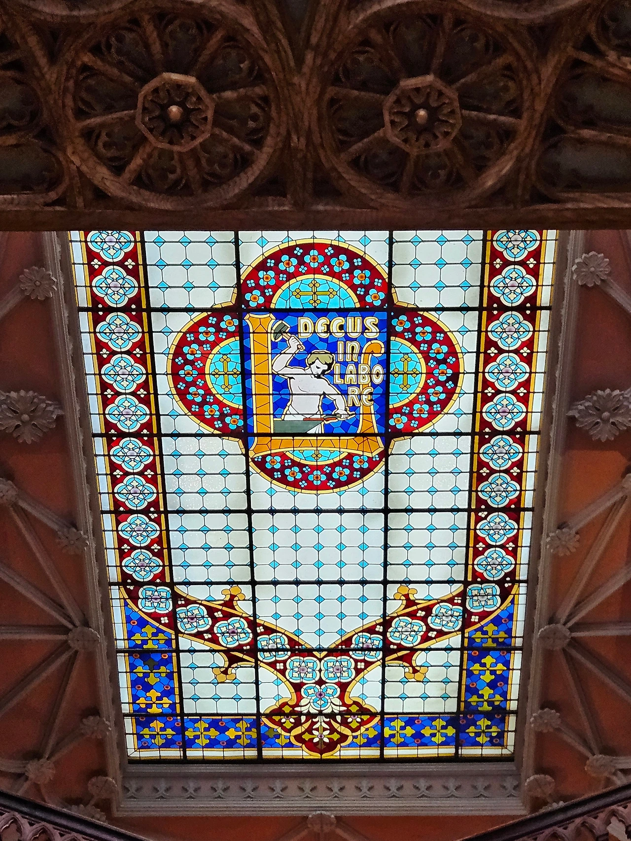 계단을 오르다 고개를 드니 스테인드 글라스 천장 한가운데 라틴어 문구가 눈에 들어왔다.