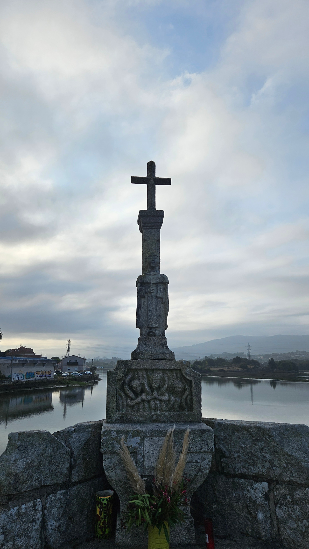 두 시간 남짓 걸으니, 아 라말로사(A Ramallosa)의 석조 다리가 눈앞에 다가왔다. 13세기 로마네스크와 고딕이 공존하던 시대에 세워진 다리는 10개의 반원형 아치로 이루어져 있었다. 다리 중앙의 십자가 기둥과 산 텔모(San Telmo)의 작은 조각상은 돌 위에 쌓인 신앙의 흔적을 고스란히 전해주었다. 항해자들의 수호성인 산 텔모가 기도로 폭풍우를 가르고 다리를 지켜냈다는 이야기가 전해지듯 바람에 스치는 공기조차 경건했다. 수백 년의 숨결이 내 발 끝에 스며드는 듯해 나는 천천히 걸음을 옮겼다. 십자가 하나가 흐르는 시간 위에서 나를 잠시 멈추게 하고 고요한 마음을 선물했다.