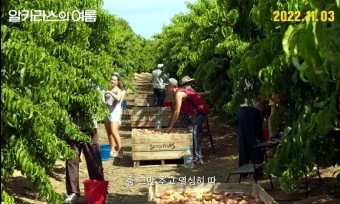 대가족 모두가 주인공이었던 만큼 사건도 많고 할 말도 많아 소란스럽고 부산했던 영화의 마지막 장면, 갖가지 사건들과 고비를 넘긴 가족들이 땀으로 거둔 풍요로운 식탁에 모두 모여있다. 서로 의견이 달라 주먹을 날렸던 여동생 가족과도 화해를 한 듯 모처럼만에 웃음이 넘친다. 그러나 그때 밖에서는 천둥과 우뢰같은 괴성이 점점 크게 다가온다. 영화의 도입부에서 파란 자동차를 장난감처럼 구겨 들어 올렸던 포크레인이 정말 외계에서 온 괴물처럼 태양빛에 익어가는 복숭아 나무들을 쓰러뜨리고 땅에 깊게 상처를 내며 헤집는 광경이 모처럼의 안도감을 공포로 뒤바꾼다. 그러나 더 무섭고 슬픈 건 포크레인 뒤에 숨은 강요된 계약서와 이익이 궁극적 목적인 경제 논리이다. 농부들이 헐값에 구매하고 큰 이익을 얻는 대형마트 유리창에 복숭아를 던져대고 목이 터져라 억울한 사연을 외쳐보지만 그 소리는 밀려드는 세상의 힘에 밀려 곧 사라져갈 처연한 몸부림에 불과하다. 햇빛과 땀을 먹고 자란 붉은 복숭아의 단맛이 대형마트 유리창에 붉은 눈물처럼 흘러내린다. 무너지는 1차 산업, 사막화 되어가는 땅, 빼앗긴 일용직 이민자들의 노동 그리고 순환의 고리가 끊긴 건강한 먹거리와 생태의 위기는 경제성장에 몰입한 성취와 진보의 욕망이 만들어낸 그림자이다.