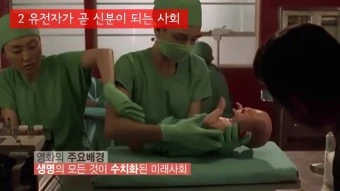 가상 미래세계의 계급은 우성 인간이 차지하는 상위 계급과 열성 인간이 속하는 하위 계급으로 나뉜다. 우성 유전자를 사는 것은 마치 뷔페에서 음식을 고르듯 부모의 경제력에 따라 최상의 품질을 가진 다양한 상품을 선택할 수 있으니 결국 경제적 조건이 상위와 하위를 결정하는 현실과 다를 바 없어 보인다. 반면 수많은 세대에 걸친 조상들의 유전자의 결과물인 자연 잉태자는 열성 유전자와 우성 유전자를 구별할 수 없는 혼합물이다. 그러니 자신도 알 수 없는 우성 유전자를 찾아내기 위해서는 세상의 벽과 부딪히고 극복해 나가는 과정에서 찾아 낼 수 밖에 없다.
