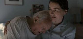 앤이 파리에서의 자신의 새 삶을 위해 아버지를 떠나게 되고 안소니가 요양원에 위탁되는 것은 스웨터 입는 것조차 제대로 하지 못하는 아버지를 안쓰럽게 바라보던 앤이 아버지를 도와 옷을 입히고 나서 예상된다. 이때 지금까지 아버지를 위해 애써온 딸에게 아버지는 진심 어린 목소리로 “앤, 모든 것에 고마워”라고 말한다. 그런 아버지를 안쓰럽게 바라보는 딸의 침묵 어린 표정 속에는 ‘아버지의 마음을 다 알아요’라는 대답이 들어있는 듯 하다. 딸에게 심통에 가까운 고집을 부리고 심지어 자기 집을 탐내는 딸로 의심하던 아버지였지만 모든 것이 아버지의 뜻이 아니었음을 어찌 사려 깊은 앤이 모를까. 딸이 이제 자신의 곁을 떠날 때가 되었음을 정신이 온전하지 않은 와중에도 예감한 안소니의 이 한 마디는 딸에게 미안함과 고마움을 담은 작별의 인사 였던 것이다. 어쩔 수 없이 아버지를 요양원에 위탁하고 울며 요양원을 나서는 앤의 모습과 함께 규칙적인 건물들이 이어져 있어 삭막해 보이기조차 하는 요양원 건물 앞의 빈 정원 중앙이 화면에 크게 잡힌다. 그 한 가운데 커다랗게 전시된 기울어지고 깨어진 얼굴의 조각이 보인다. 안소니의 깨어진 삶처럼.