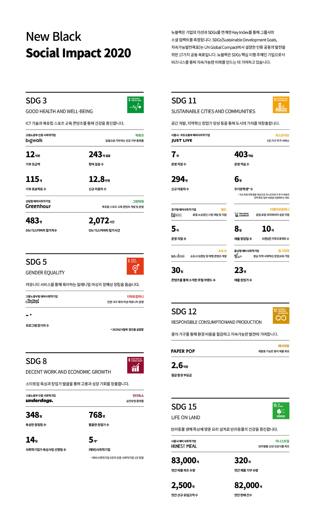 뉴블랙은 기업의 미션을 SDGs와 연계한 Key Index를 설정하여 그룹사의 소셜 임팩트를 측정합니다. SDGs(Sustainable Development Goals, 지속가능발전목표)는 UN Global Compact에서 설정한 인류 공동의 발전을 위한 17가지 공동 목표입니다. 뉴블랙은 SDGs 핵심 이행 주체인 기업으로서 SDG3(건강과 웰빙), SDG8(양질의 일자리와 경제성장), SDG11(지속가능한 도시) 등을 중심으로 지속가능한 미래를 만드는 데 기여하고 있습니다. 2020년 뉴블랙이 총 11개의 포트폴리오사(4개의 자회사와 7개의 피투자사)를 통해 만들어낸 소셜 임팩트는 다음과 같습니다.
