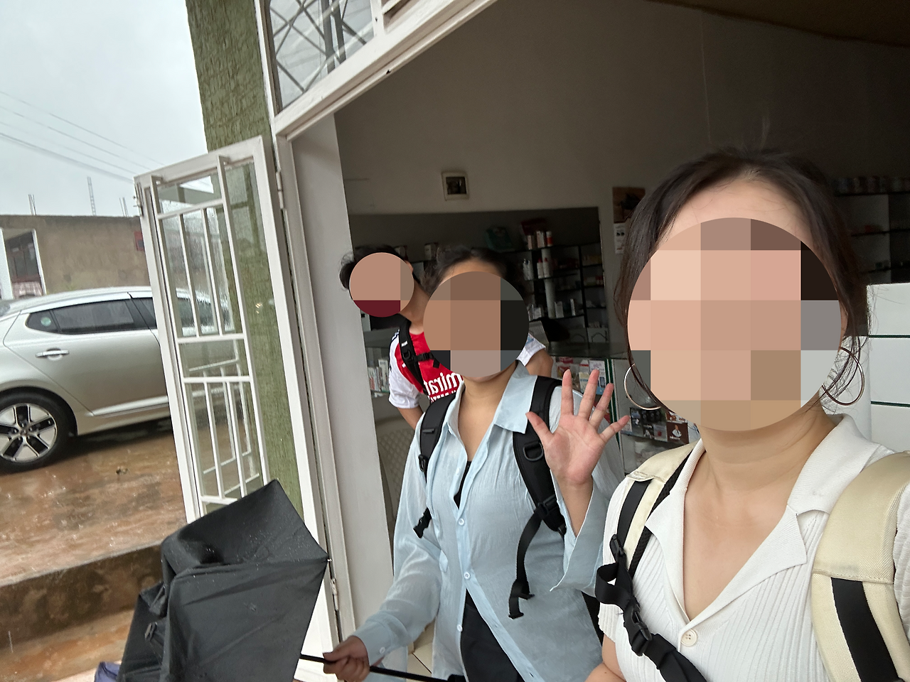 결국 우리는 근처 약국 처마 아래로 몸을 피했다.