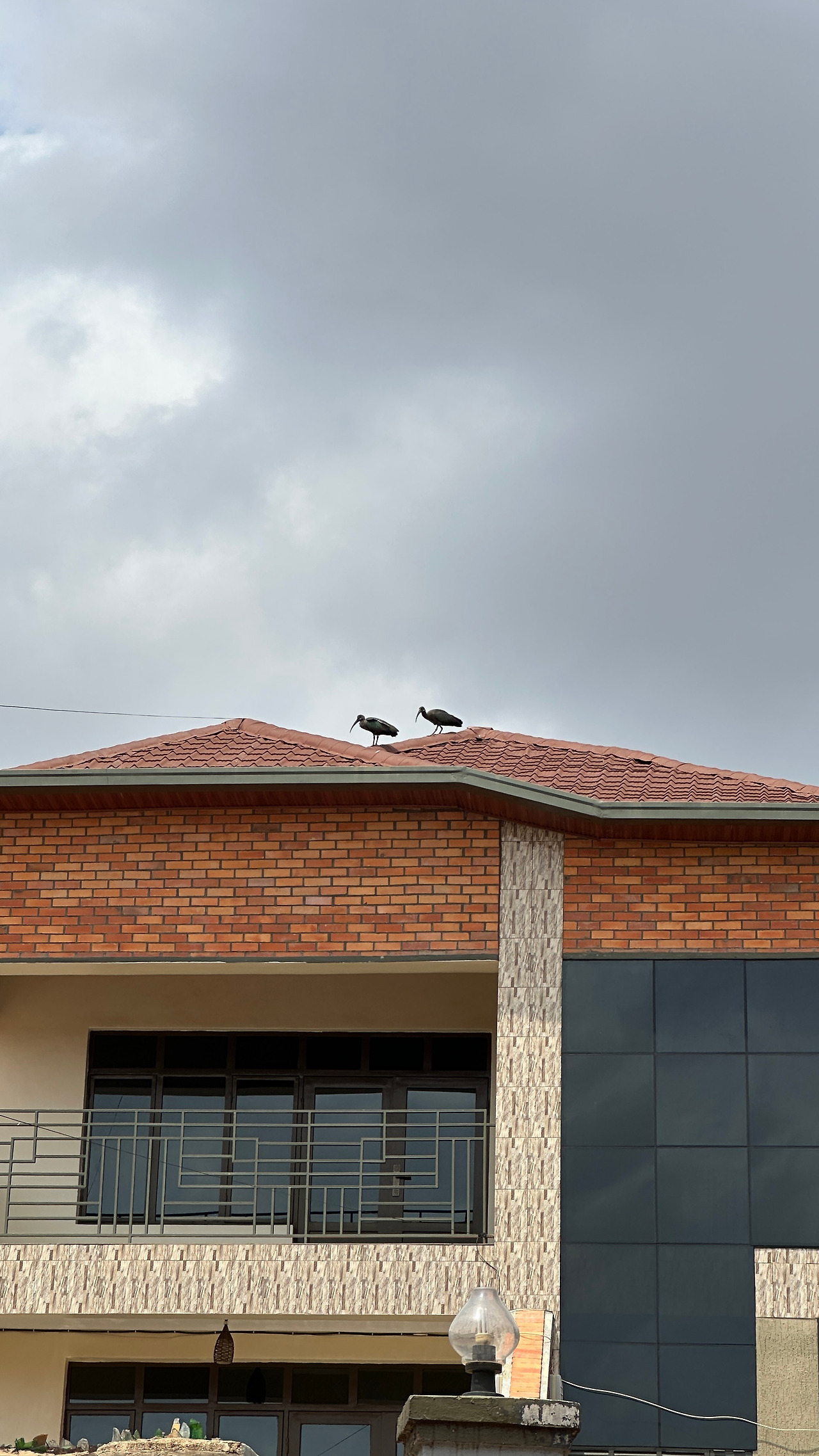 '르완다는 길가에 새가 별로 없구나'라고 안심하던 순간, 지붕 위의 두 마리를 마주쳤다.
