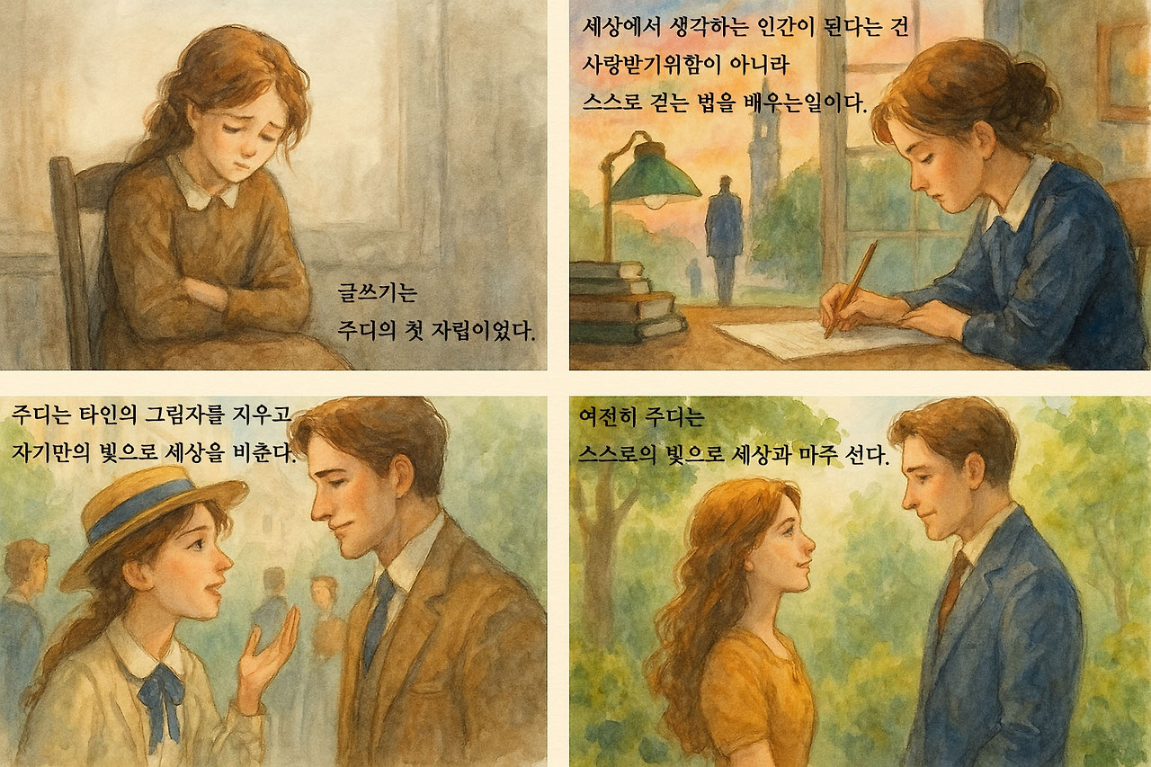 글쓰기는 주디를 후원자에게 이끌었고, 대학교 생활을 하면서 자기 안의 목소리를 깨닫는 계기가 되었다. 또한 타인의 인정을 기다리던 소녀가 글쓰기를 통해 자기만의 문장을 갖는 순간이기도 했다. 글쓰기는 주디의 첫 자립이었던 셈이다.