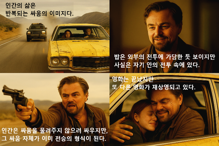 결국 영화 《One Battle After Another》는 멈출 수 없는 싸움 속에서 인간이 어떤 목적성을 가지고 살아가야 하는가에 대한 질문이다. 자동차 추격전이 펼쳐진 도로처럼 이어지는 일상은 세상을 향한 전투가 아니라 언제나 자신을 향한 전투로 돌아온다는 사실을 기억해야 한다. 그 싸움이 반복될수록 인간은 자신이 무엇을 지키고 싶은 존재인지를 깨닫게 될 것이다.