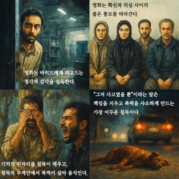 “그저 사고였을 뿐”이라는 말 뒤에는 말하지 못한 누군가의 인생이 길게 이어진다. 제목 뒤에 길게 이어진 꼬리가 영화 전체를 끌고 간다. “그저 사고였을 뿐”이라는 말은 책임이 사라진 자리에 남은 가장 어두운 침묵이다.