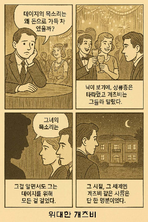 개츠비는 데이지가 돈이 없으면 살아갈 수 없는 인물이며 속물이라는 것까지 알고 있었다. 그럼에도 불구하고 그녀를 위해서 자신의 모든 것을(목숨까지) 걸었다.(어찌 보면 개츠비도 데이지의 부유한 모습을 욕망한 것일지도 모른다.)