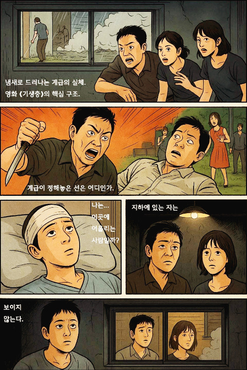 아들 기우은 계속 묻는다. 내가 여기에 어울리냐고. 하지만 행동하지는 않는다. 만성화된 고통은 의지를 꺾는다. 자신을 보는 진실을 가리는 것, 쉬운 길이다. 기택은 지하에서 계속 살 수도 있을 것이다. 부자들은 아래로 내려가지 않을 것이므로. 지하 벙커의 존재도 모를 것이다. 자신이 아는 것이 전부인 양 살아갈 것이다.